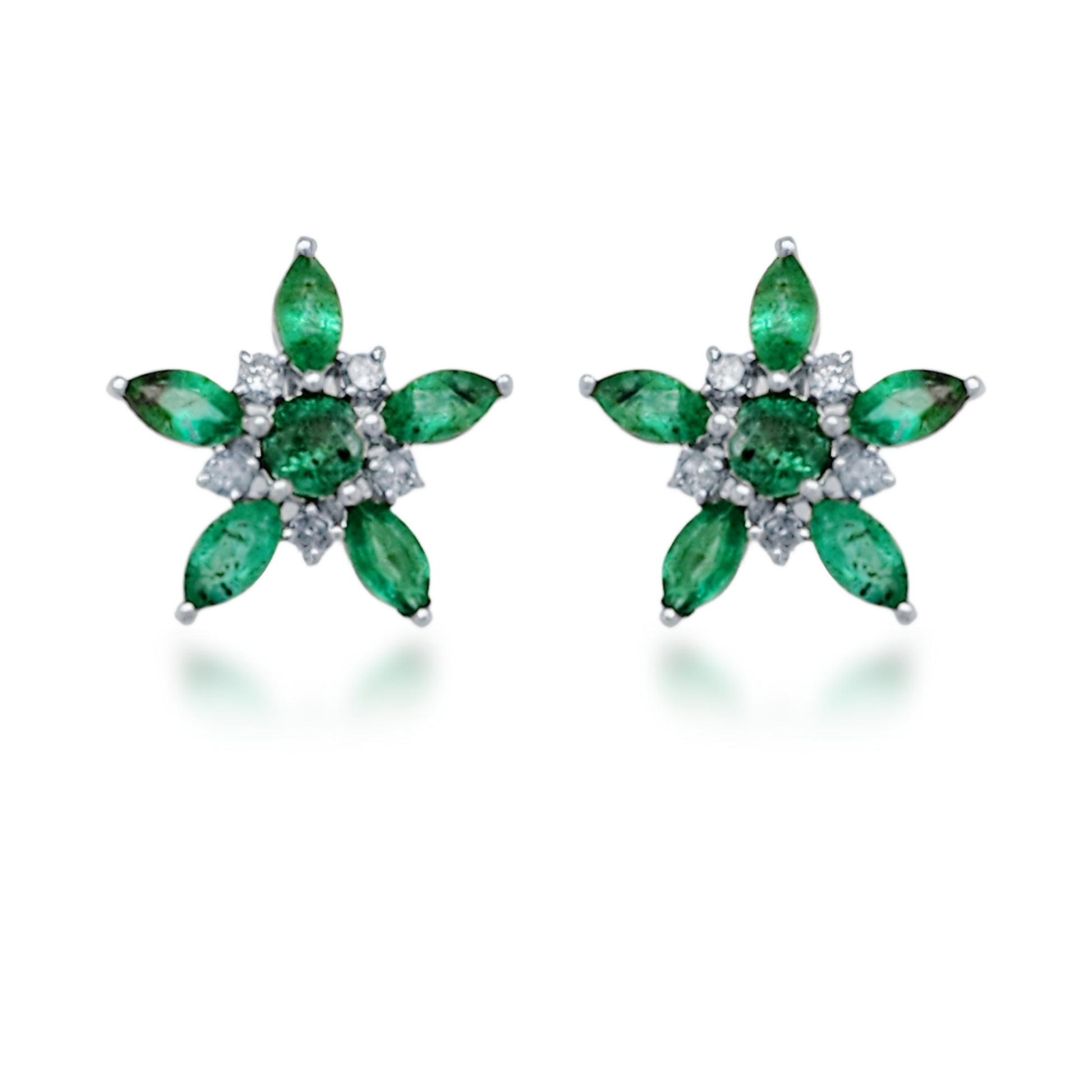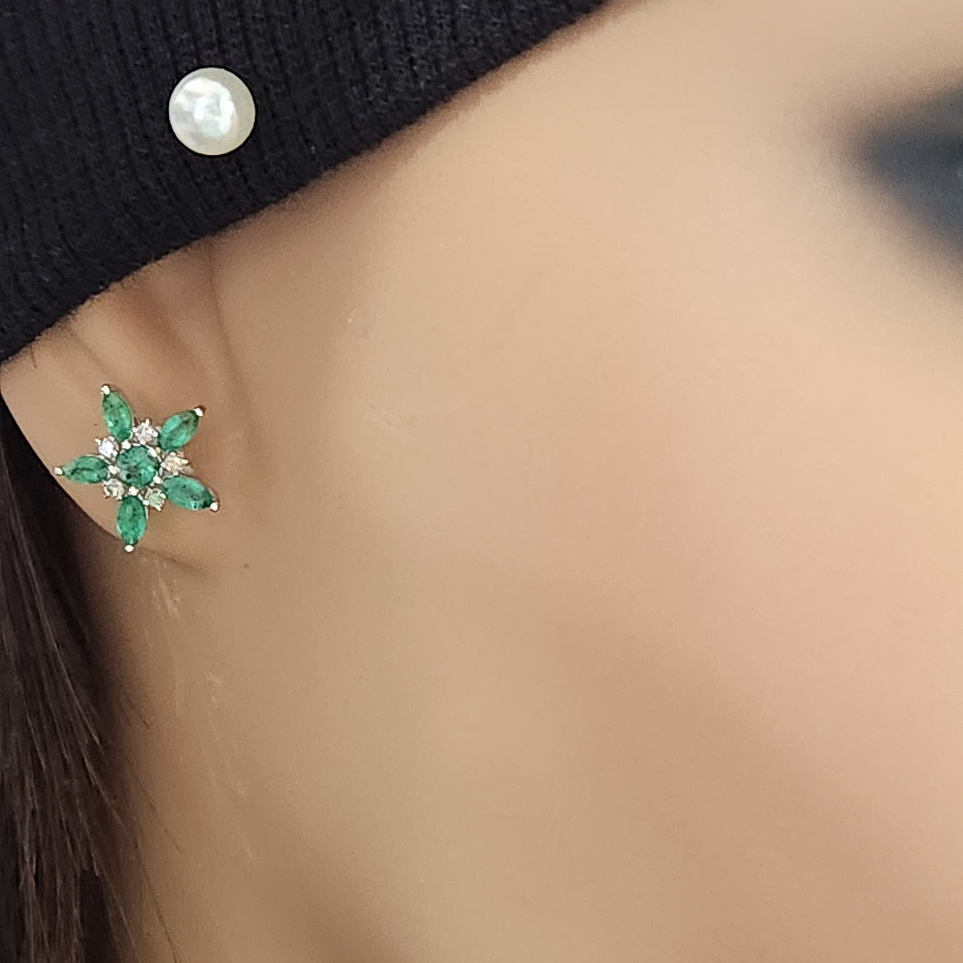 10K Gold Diamond and Emerald Flower Stud Earrings