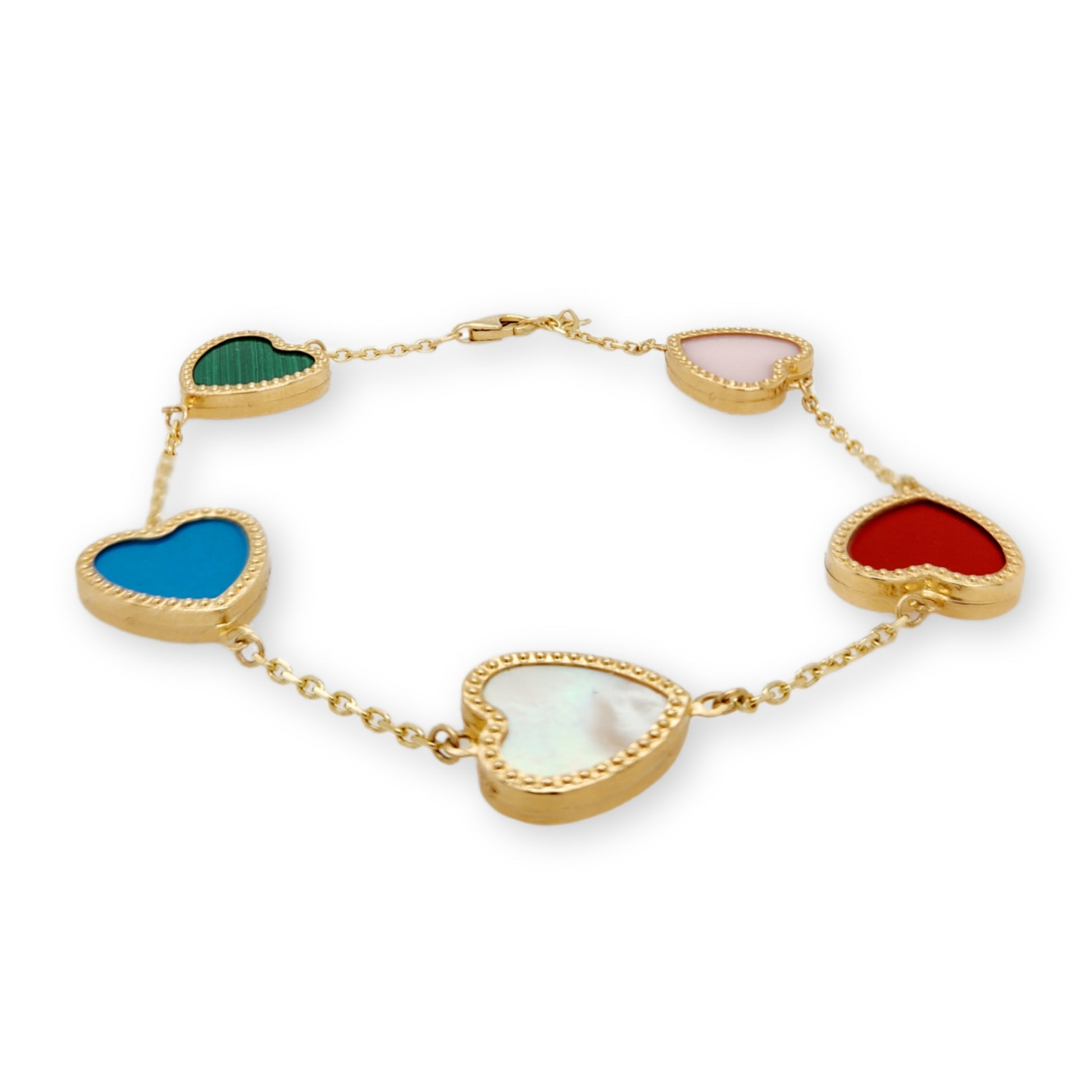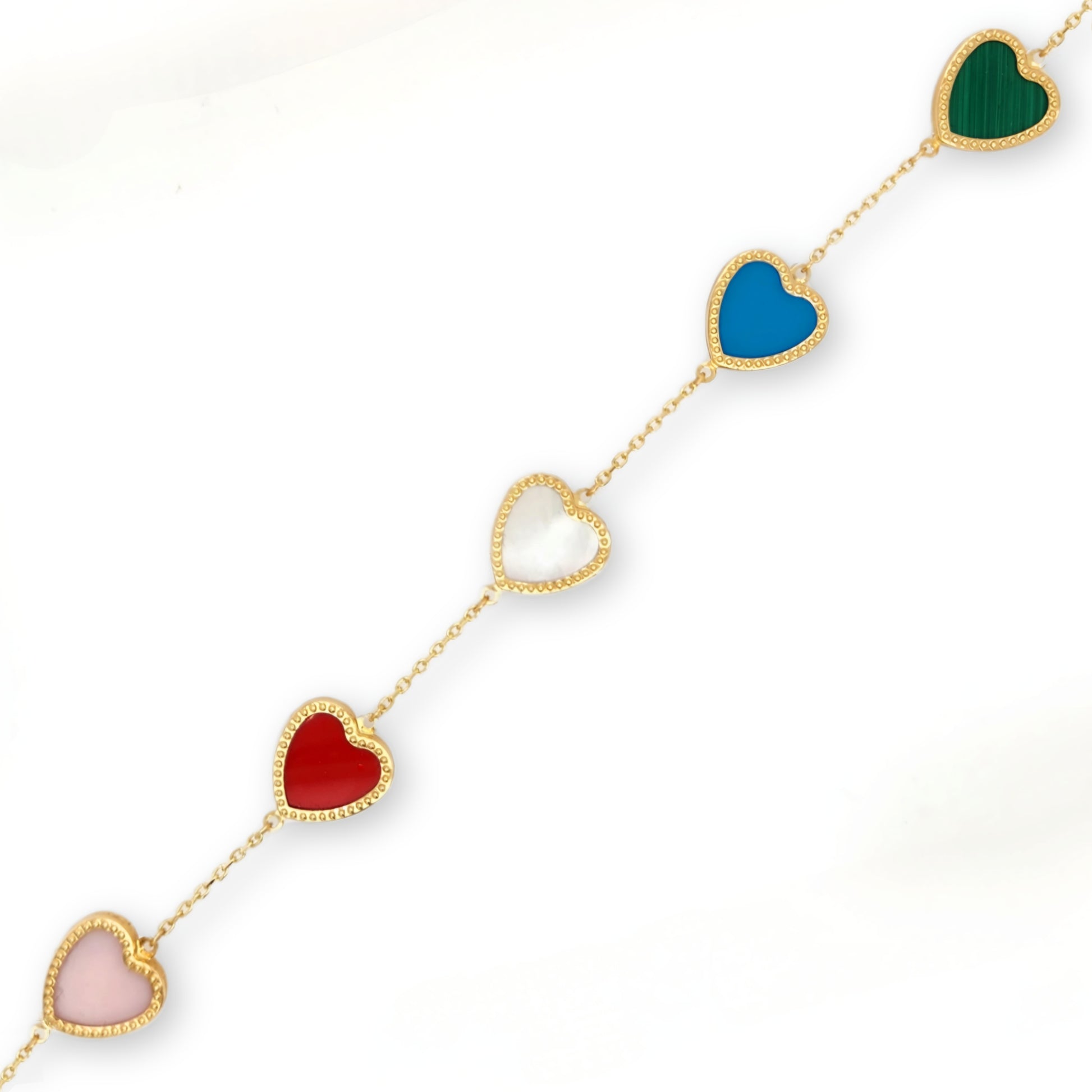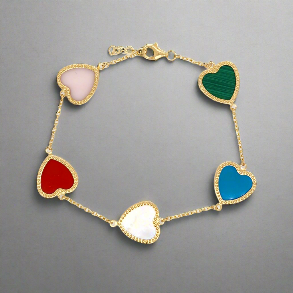 Add a pop of color to any outfit with this stunning 14k Gold Colored Beaded Border Heart Bracelet. Featuring red, turquoise, malachite, mother of pearl, and pink mother of pearl hearts, this bracelet measures 7 inches with an additional half inch extension for the perfect fit.