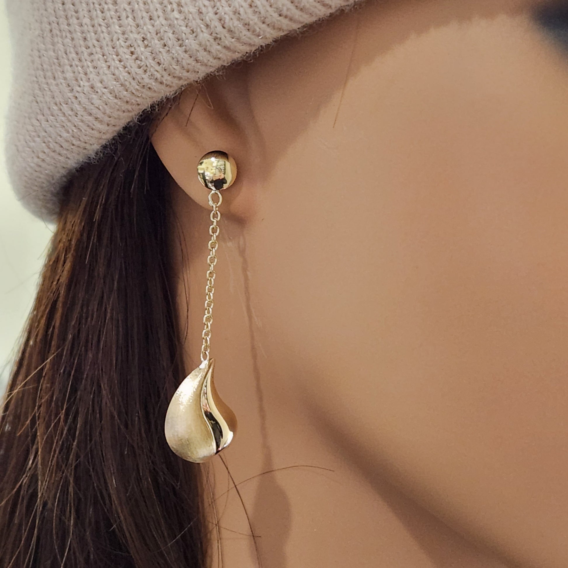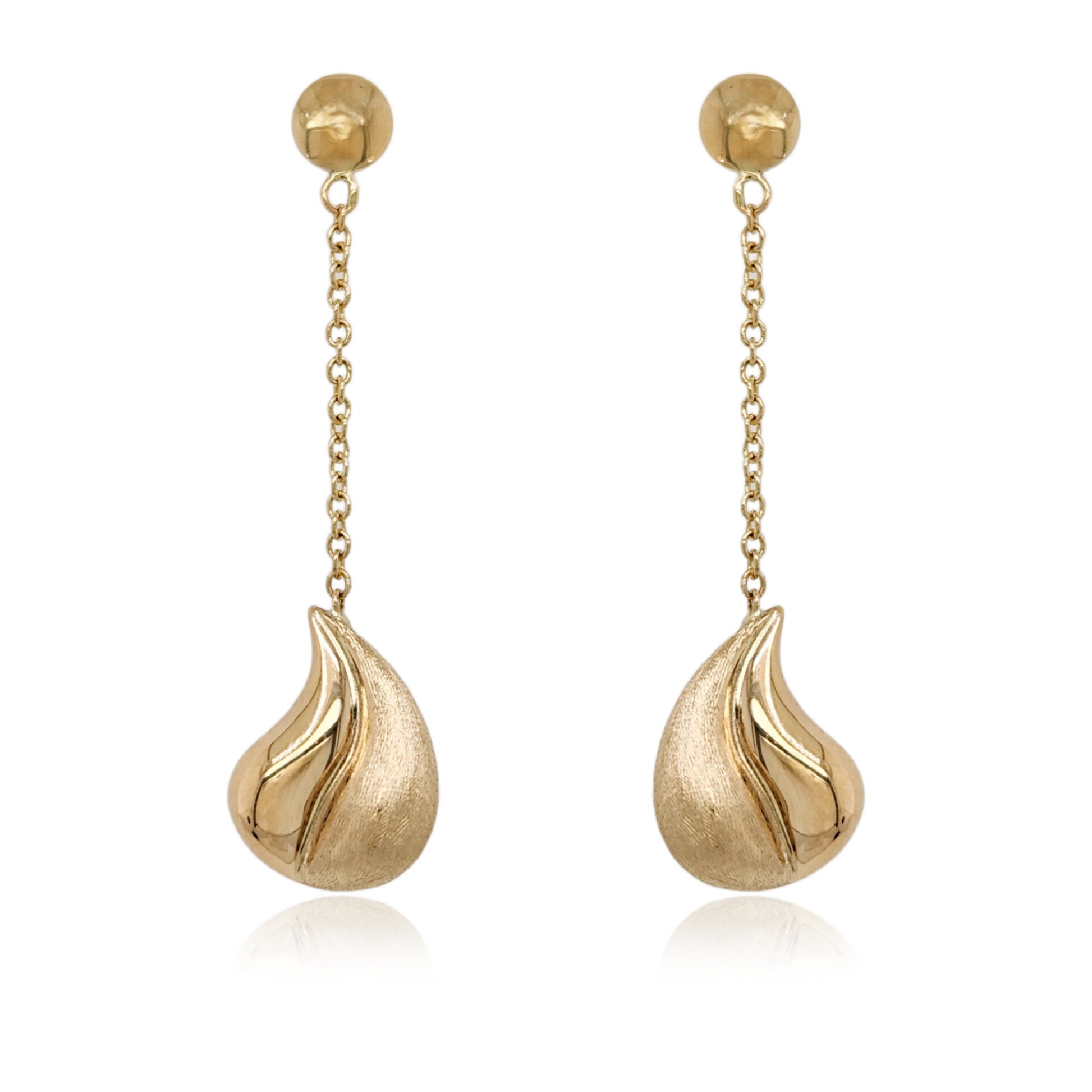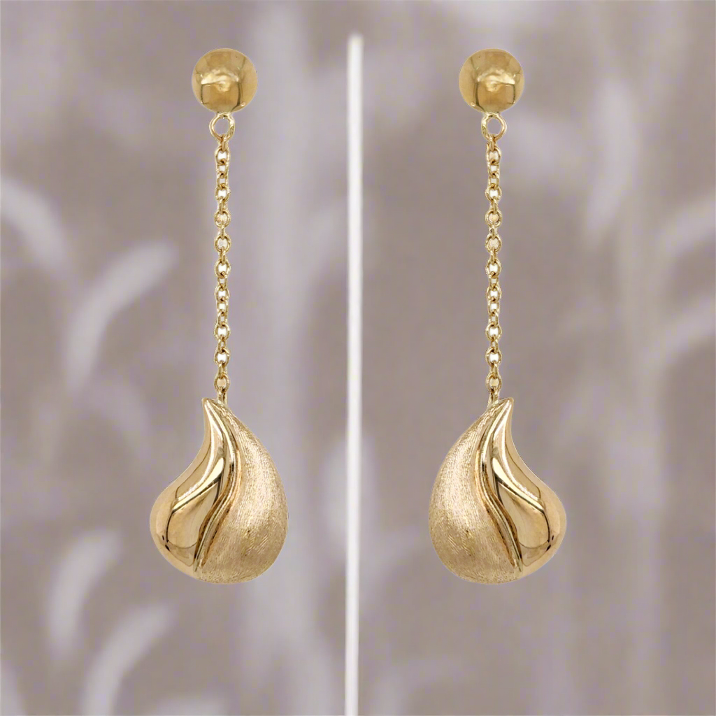 14K Gold Dangling Brushed and Shiny Teardrop Earrings