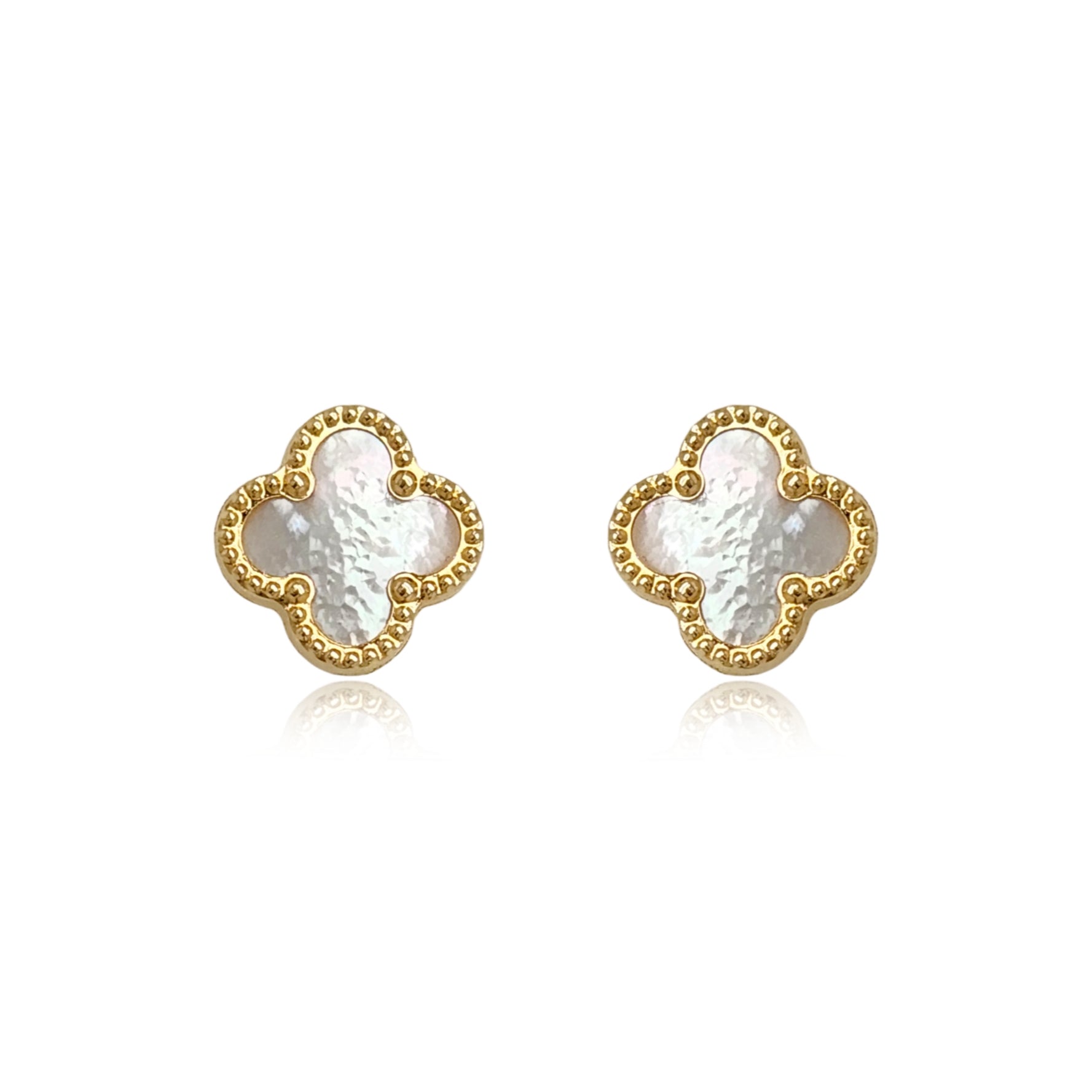 14k Gold Mother of Pearl Clover Stud Earrings with Beaded Border
