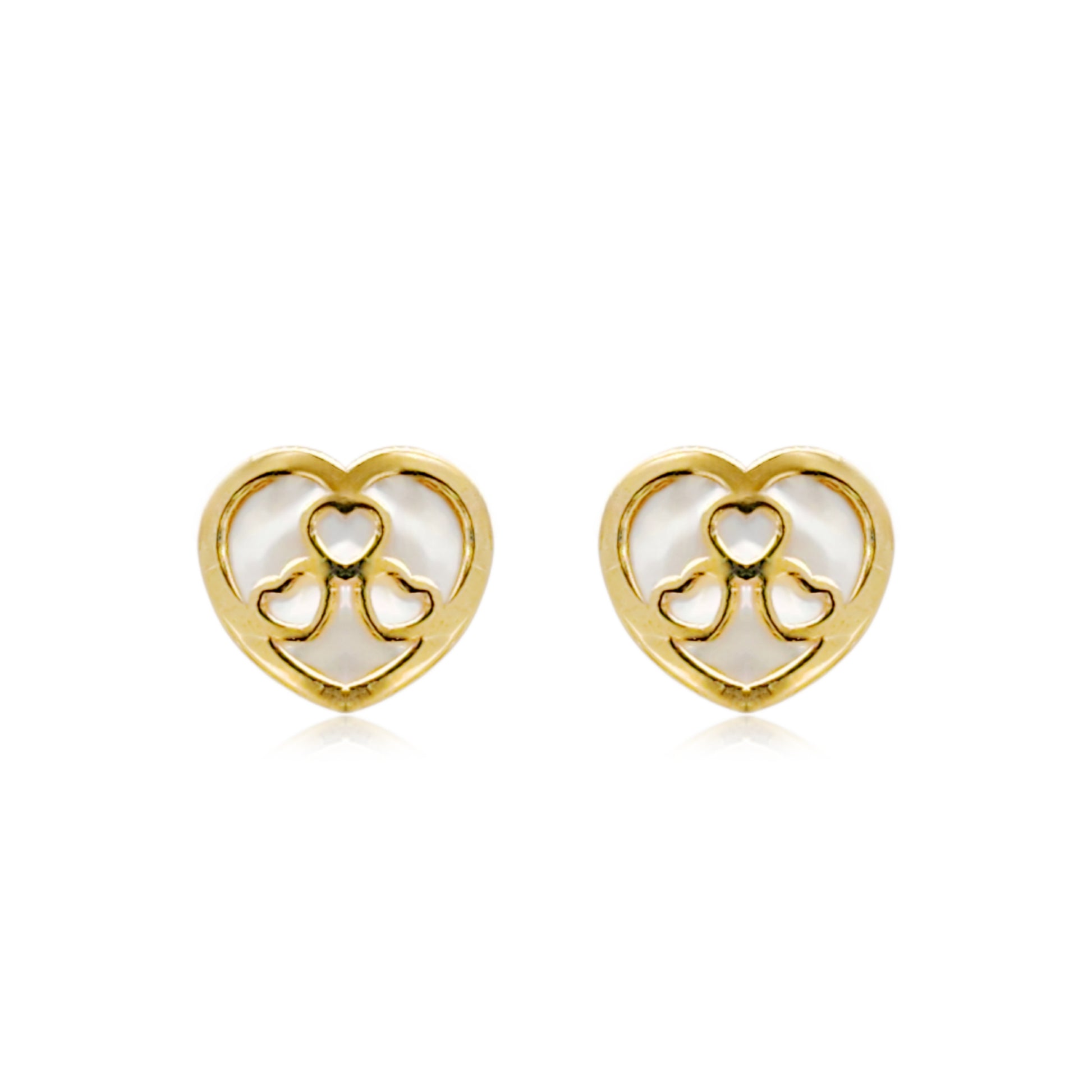 14k Gold Mother of Pearl Heart with Three Heart Overlay Stud Earrings
