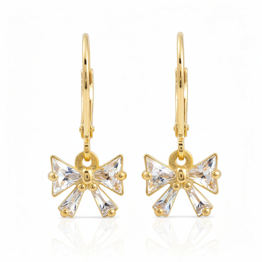 Elegant bowknot earrings designed for kids and teens, featuring triangle and baguette-cut cubic zirconia stones set in hypoallergenic surgical steel.