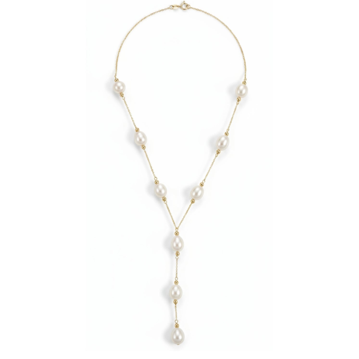 Effortlessly elegant, this lariat-style necklace features lustrous freshwater pearls set along a delicate 14K gold chain, finished with a graceful drop pendant. A timeless piece that transitions seamlessly from day to evening.