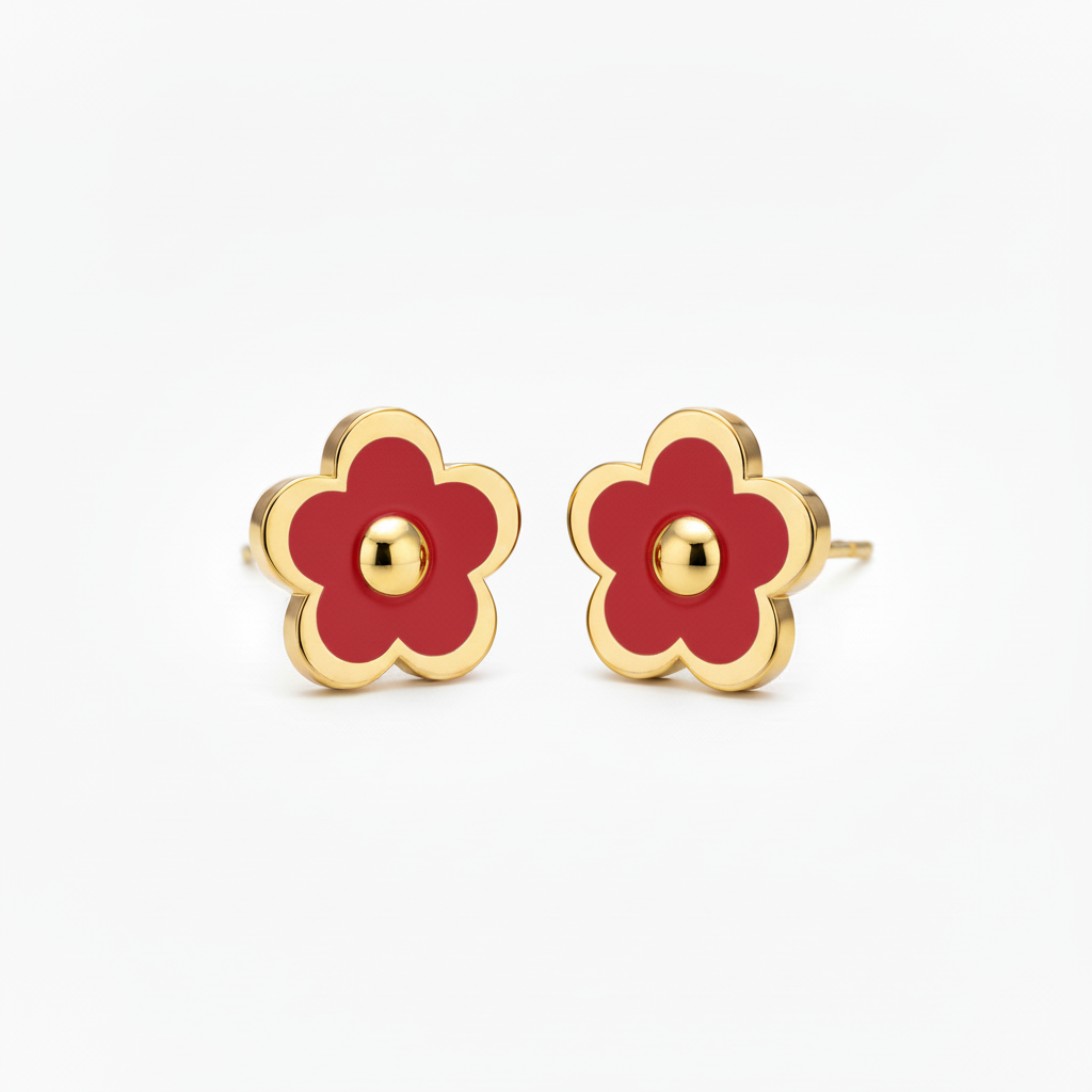 Delight in these adorable gold-plated enamel flower stud earrings, featuring a sweet 5-petal design with a distinctive center circle. The vibrant enamel colors add a playful pop to any outfit, making these perfect for children who love colorful, fun jewelry.