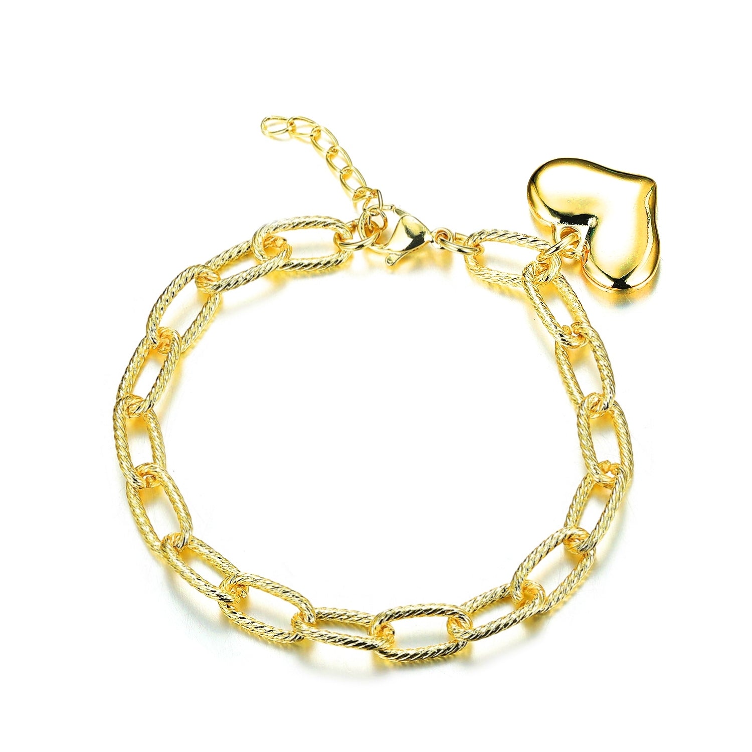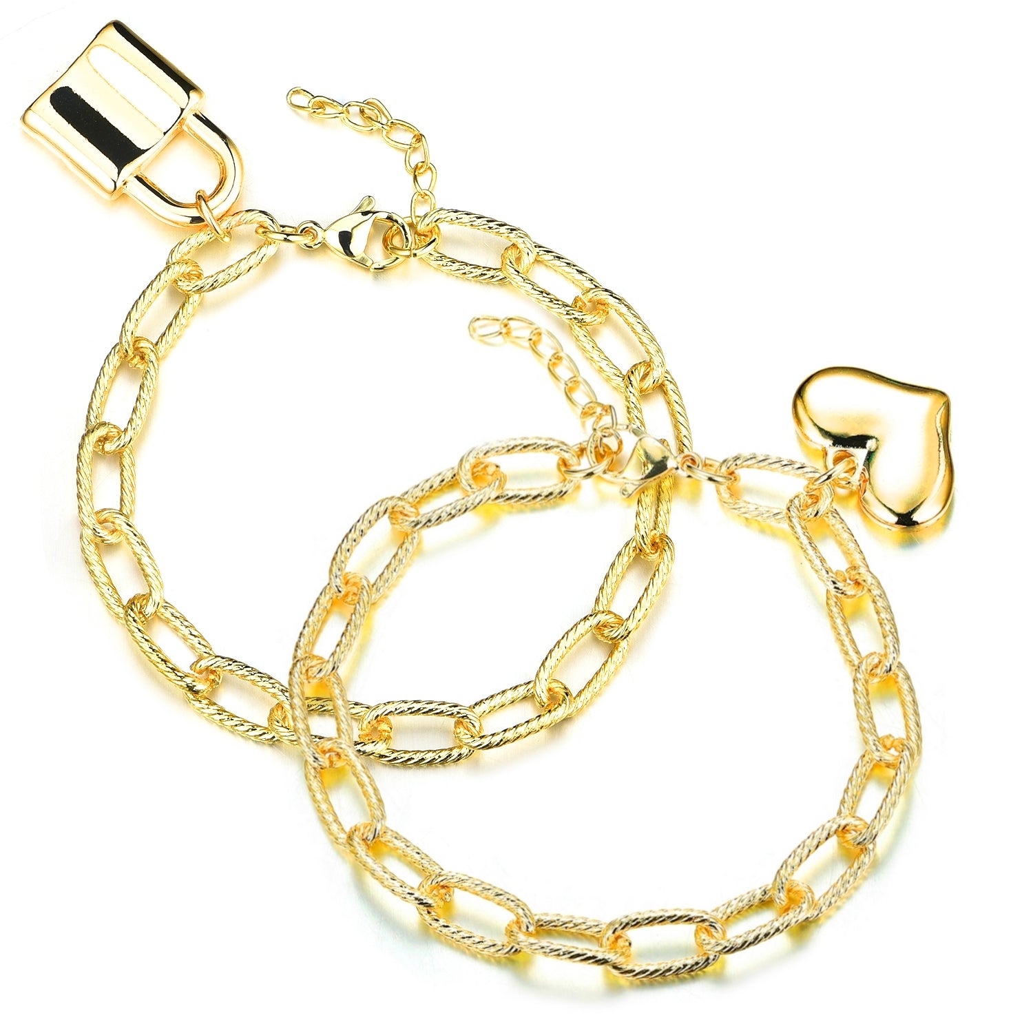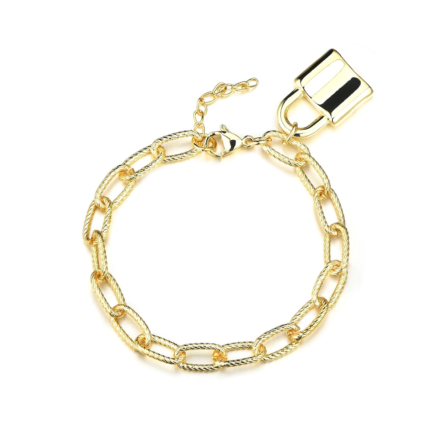 "Upgrade your wrist game with our Gold Plated Large Link Bracelet. The oval links, plated in luxurious gold, add a touch of elegance, while the assorted charms offer a personalized touch. Choose from a heart or lock charm for added style. Upgrade your style with this bracelet today!"