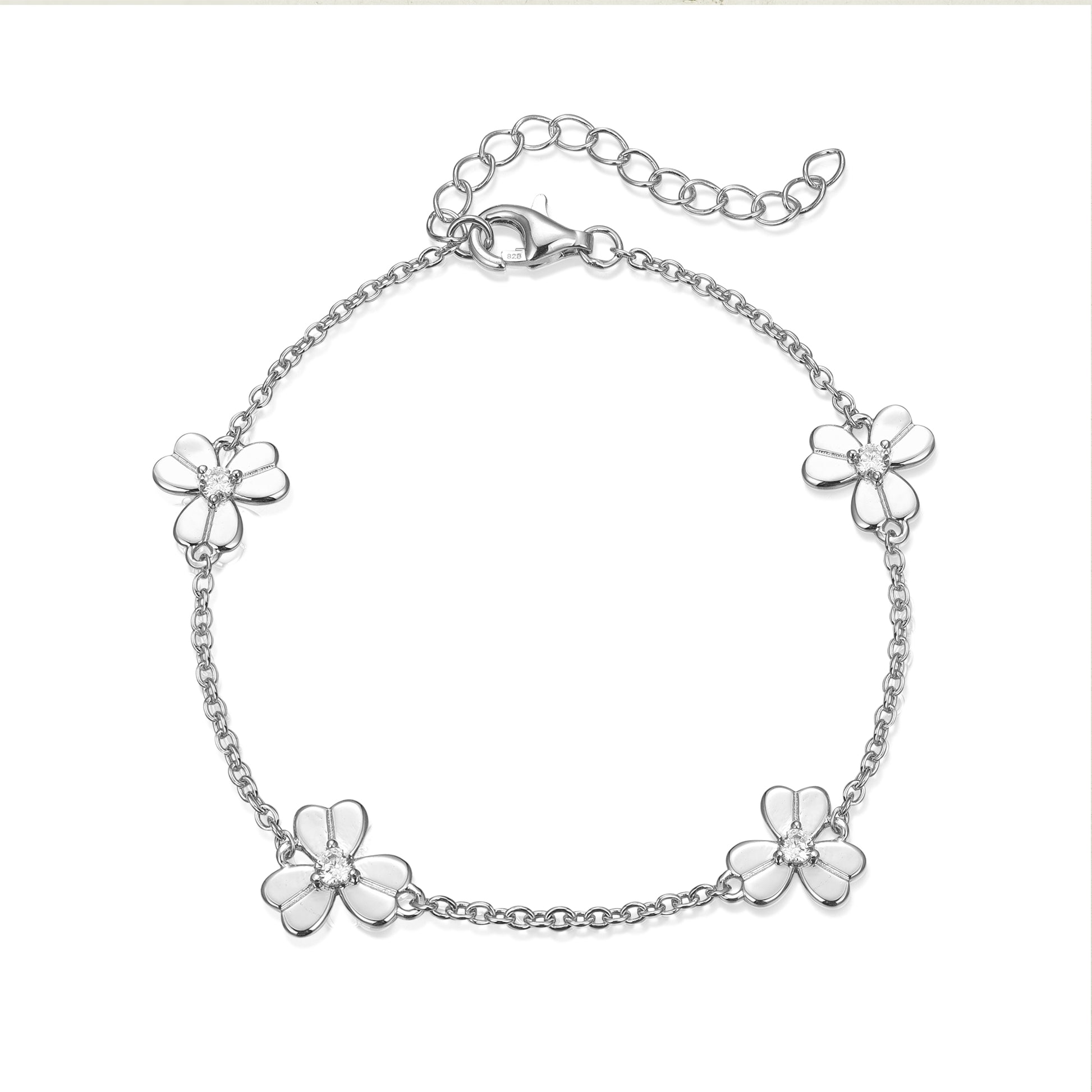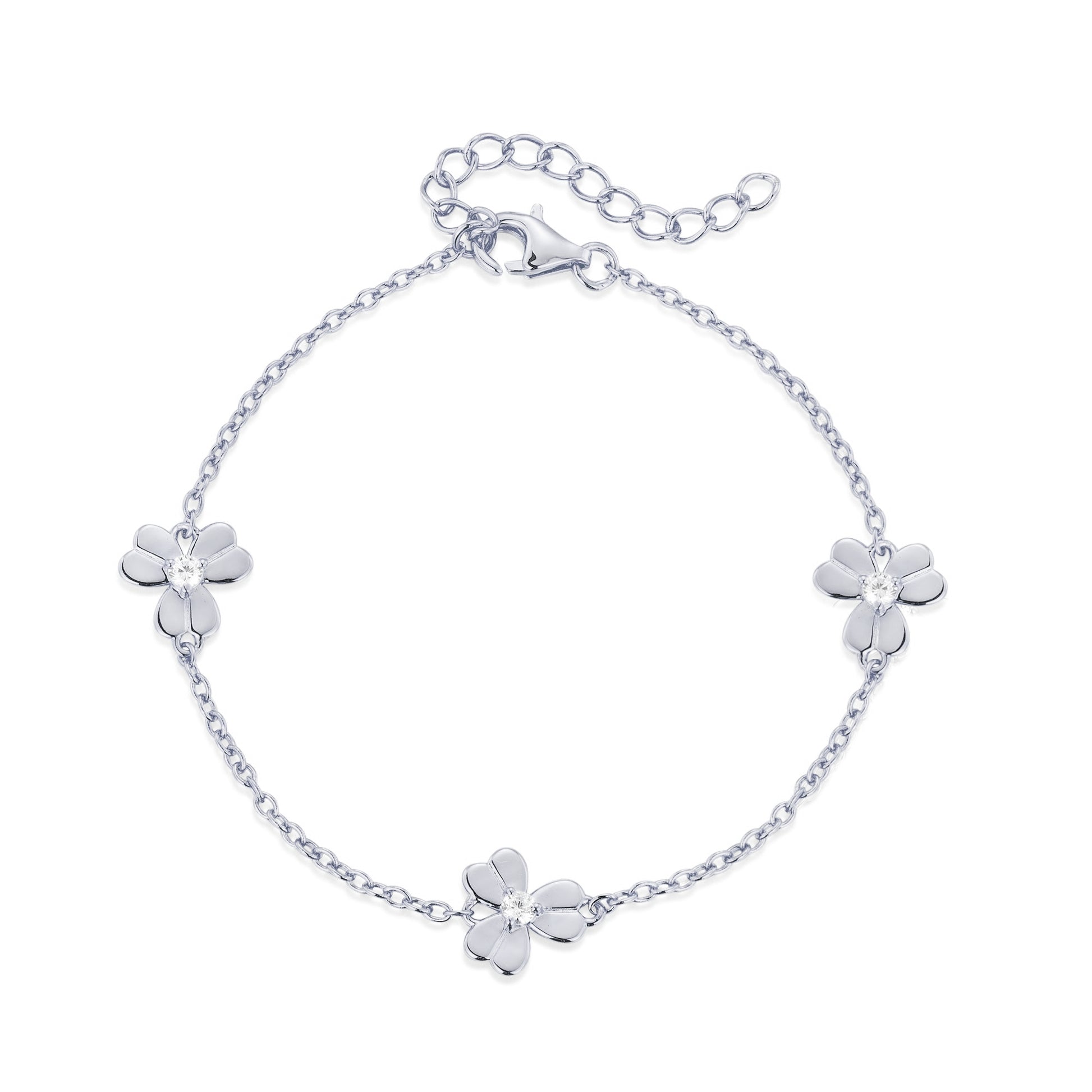 Gold Plated or Rhodium Plated Sterling Silver Three Leaf Flower With CZ Station Bracelet