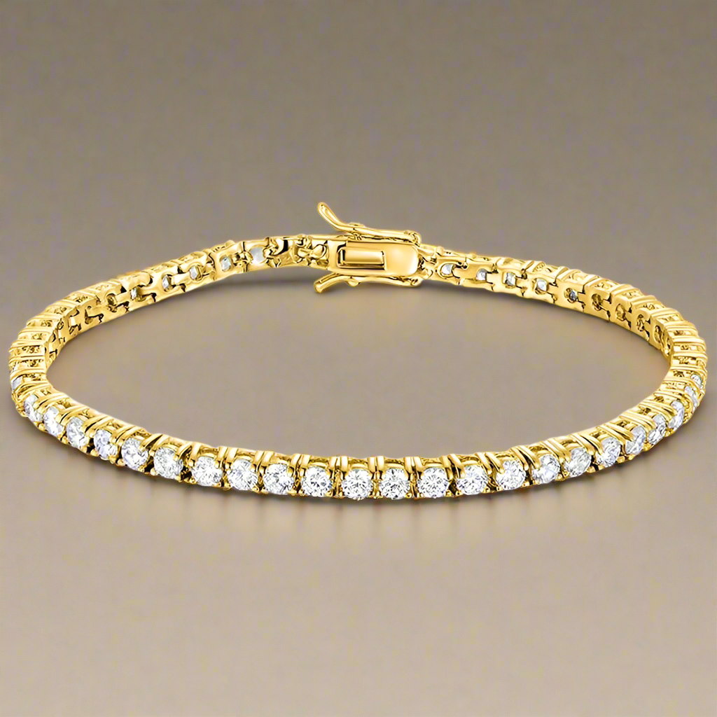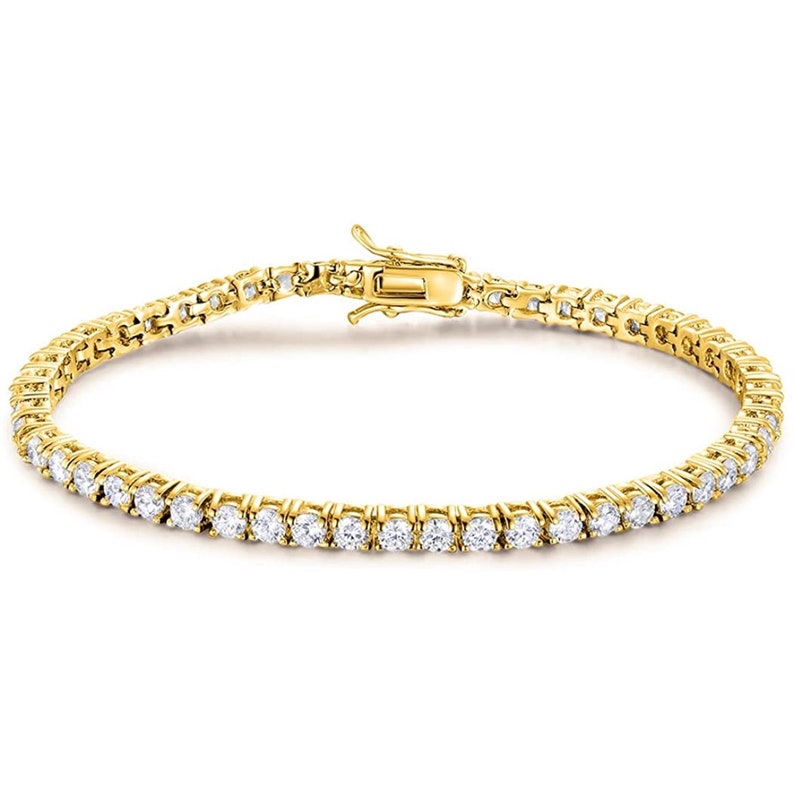 Sterling silver gold-plated round brilliant cut CZ tennis bracelet. Adorn your wrist with the timeless brilliance of this sparkling tennis bracelet, crafted with gold-plated .925 sterling silver and set with dazzling round brilliant cut cubic zirconia stones. An eye-catching accessory for any occasion.