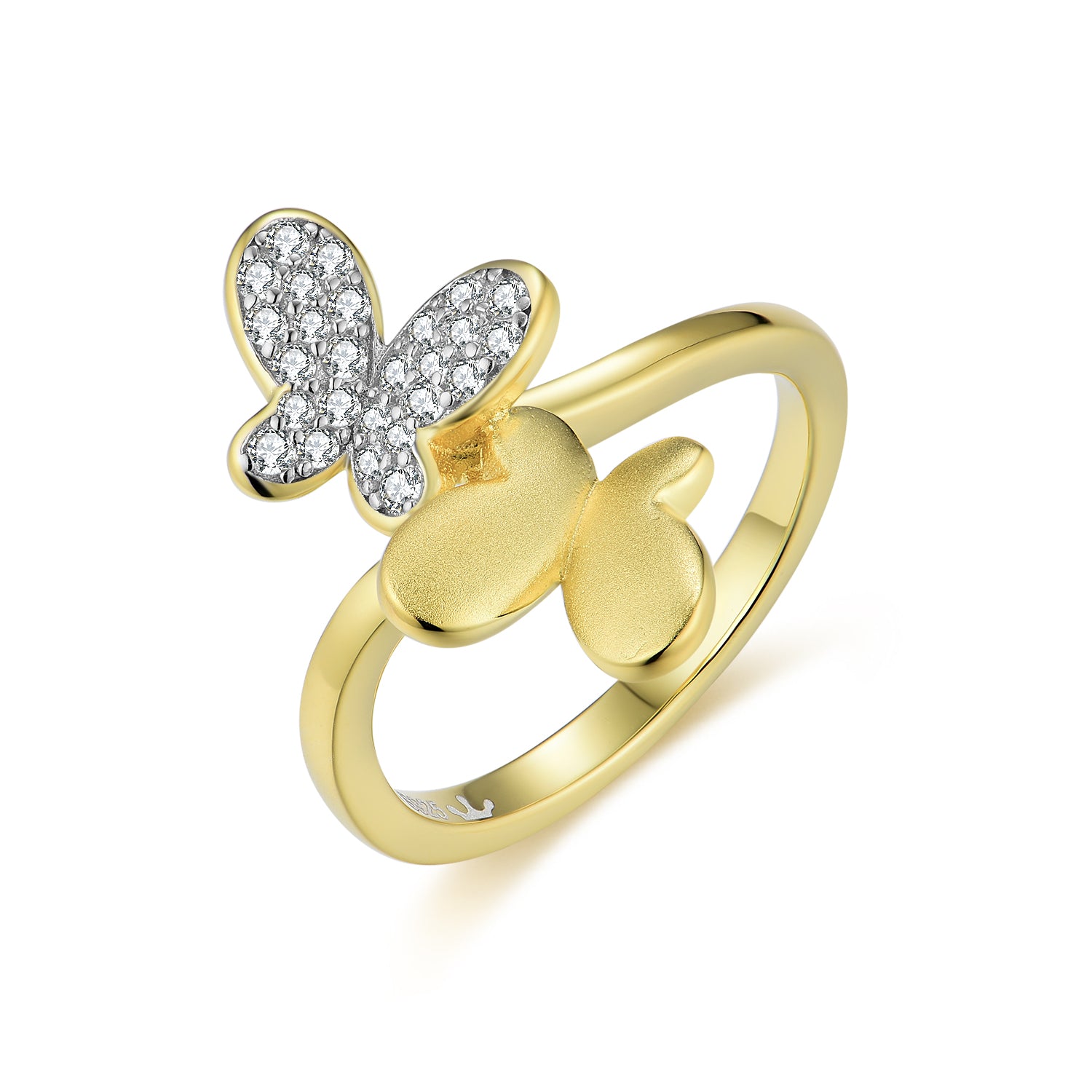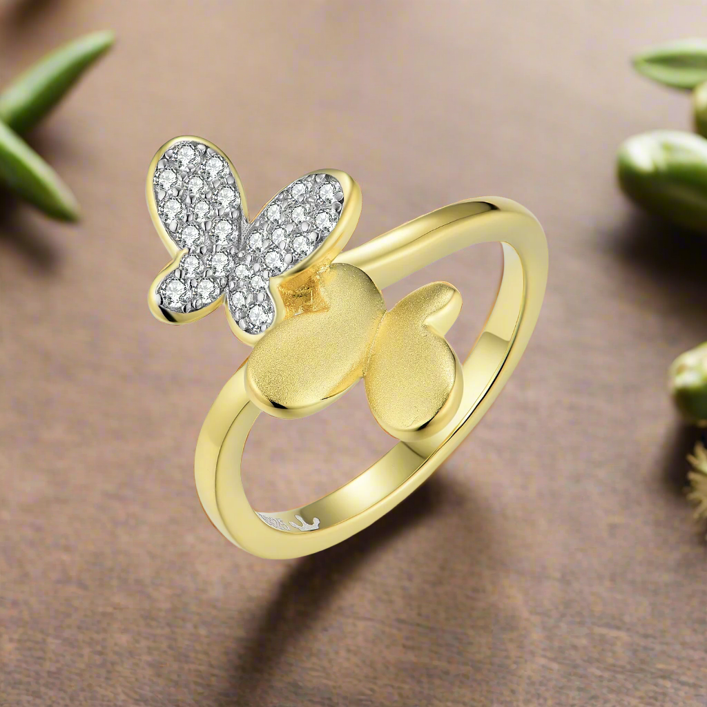Discover the beauty of our Gold Plated Sterling Silver Double Butterfly Ring! This gorgeous piece features two stunning butterflies - one with a brushed finish and the other adorned with sparkling CZ stones. Available in sizes 4-9, this ring is a must-have for any jewelry lover who wants to make a statement.