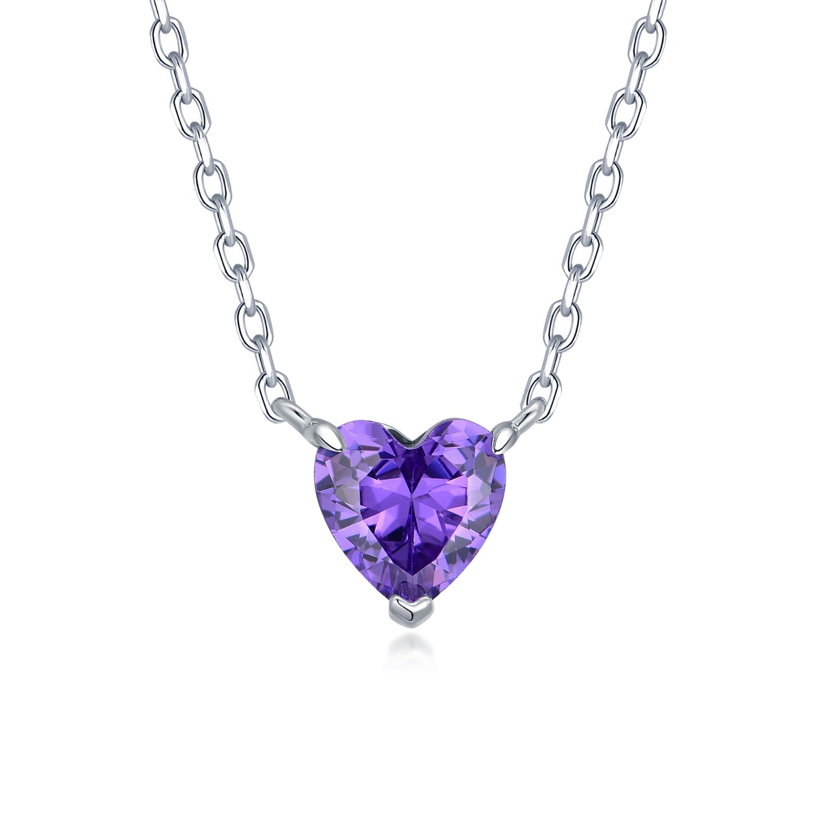 Elegant sterling silver chain necklace featuring a vibrant purple heart-shaped pendant with a brilliant 6mm cubic zirconia gemstone. The deep amethyst-hued CZ is expertly cut to catch and reflect light with every movement.