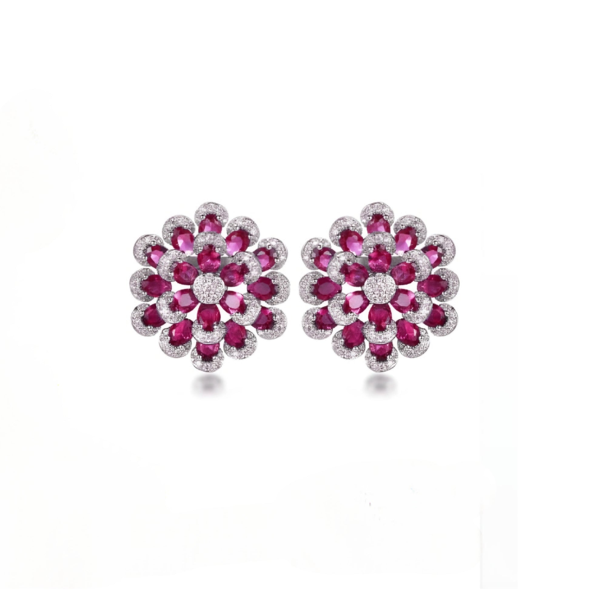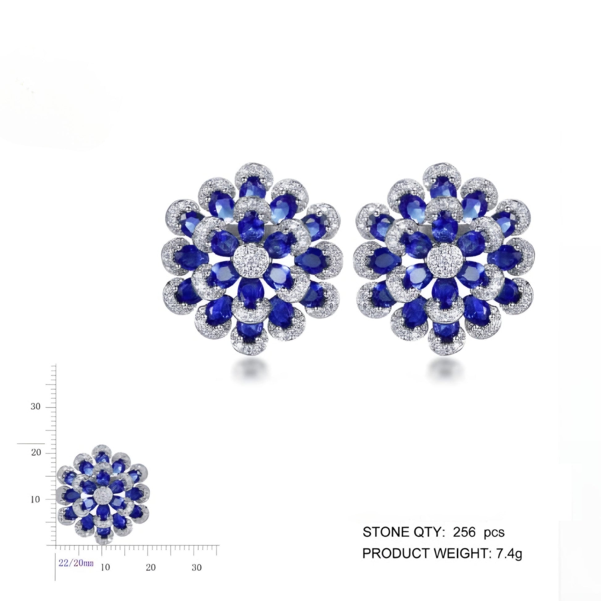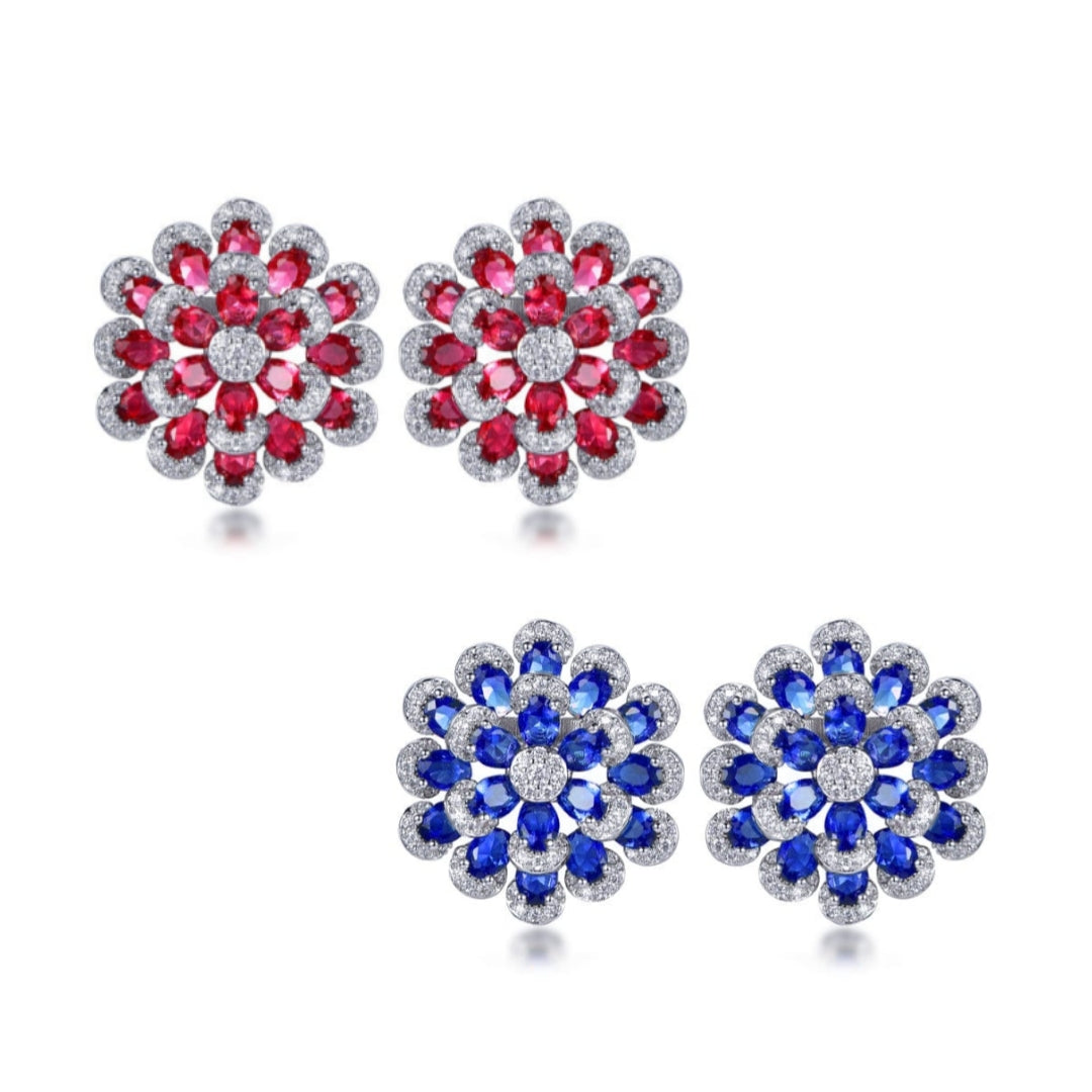 These stud earrings feature a stunning and eye-catching design, with 128 crystal stones adorning each earring. The stones are clear, with ruby or sapphire color, giving you the choice to select the one that best suits your personal style or occasion. The earrings measure 20mm in diameter, making the earrings a bold and statement-making accessory.