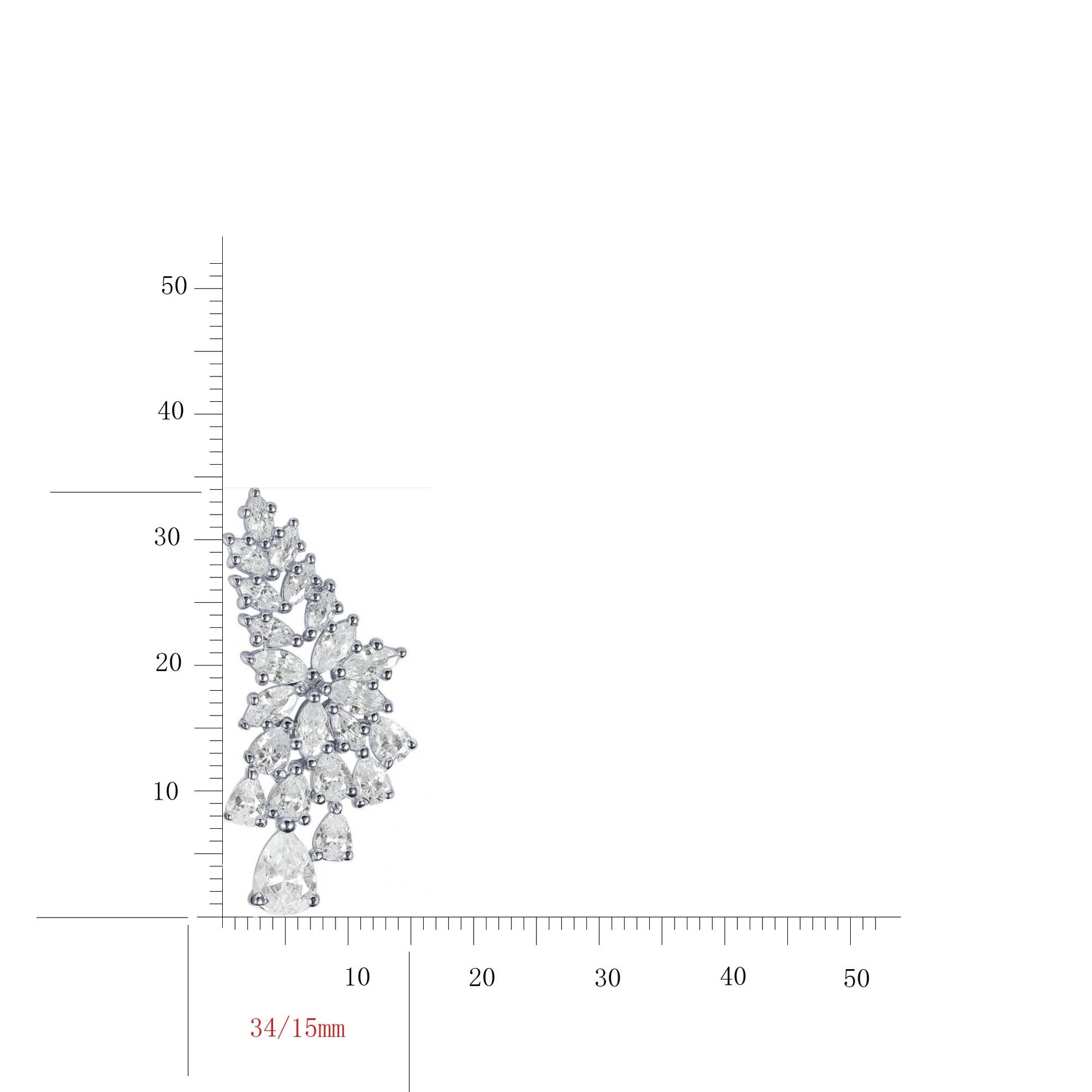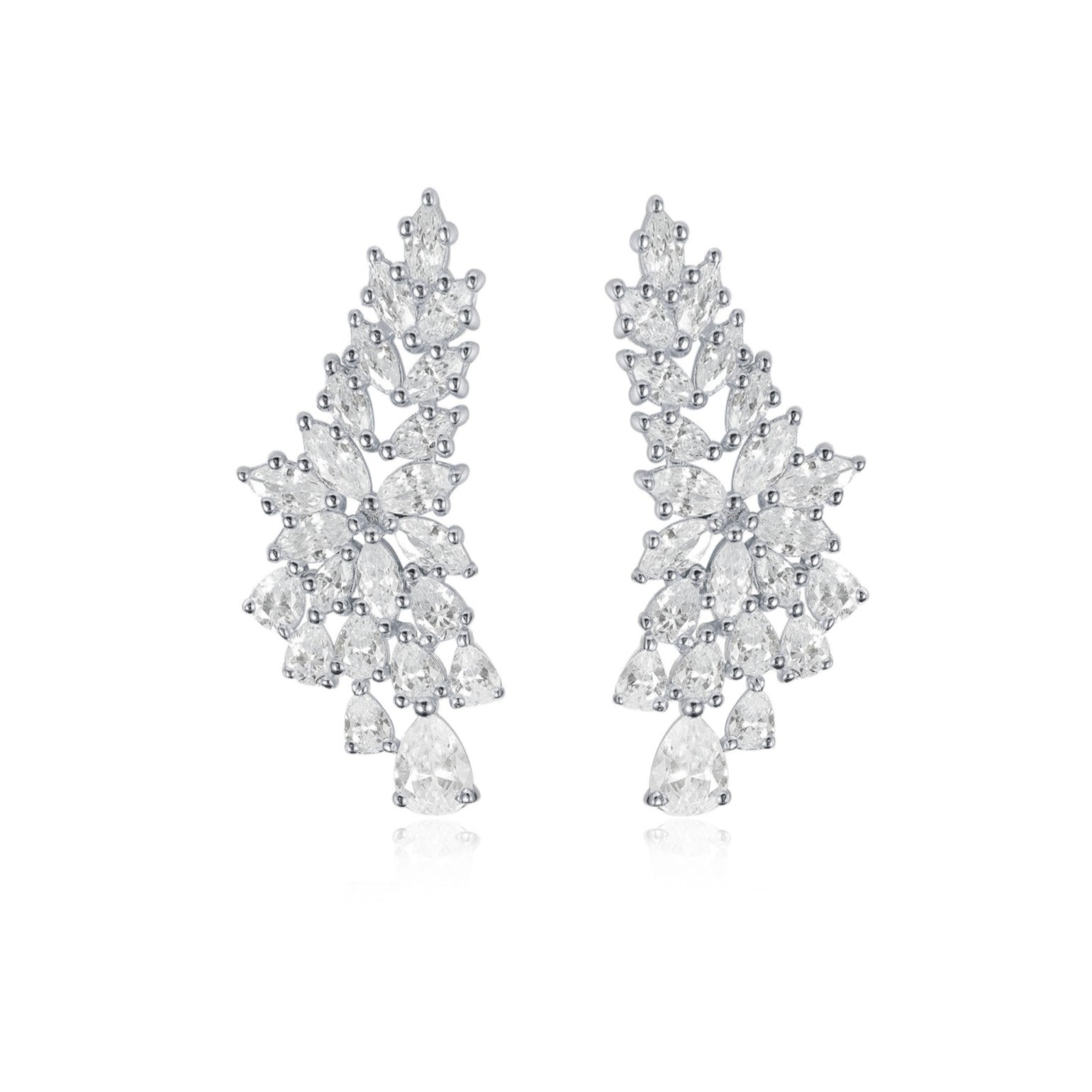 Indulge in luxury with our Rhodium Plated Sterling Silver Long Floral Stud Earrings. These earrings feature a stunning moon-shaped cluster of pear and marquis shaped stones, and measure in at 34x15 mm. Elevate your look with these elegant and exclusive earrings.