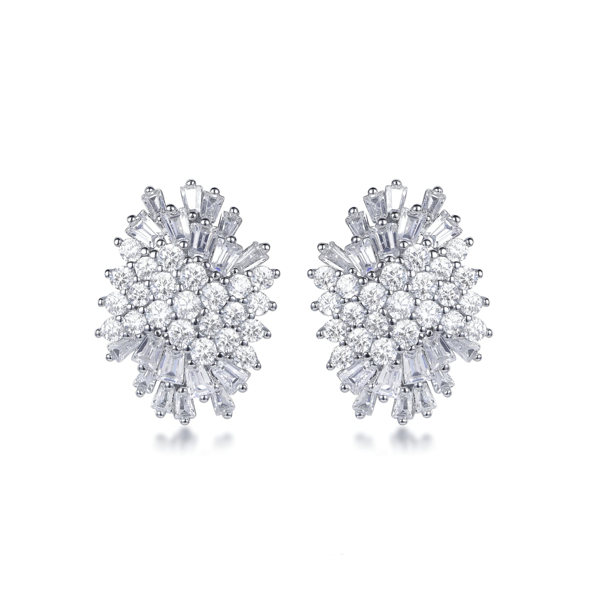 Indulge in luxury with our Rhodium Plated Sterling Silver Round and Baguette CZ Cluster Stud Earrings. The combination of exquisite round and baguette CZ stones, set in sleek sterling silver with rhodium plating, creates a dazzling cluster that will elevate any look. Experience elegance at its finest.