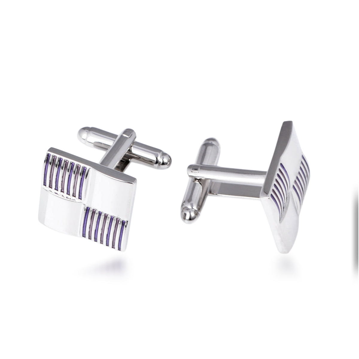 Striking brass cufflinks featuring a shiny silver color finish with purple striped squares. These eye-catching cufflinks combine metallic shine with vibrant purple accents for a bold, contemporary look.