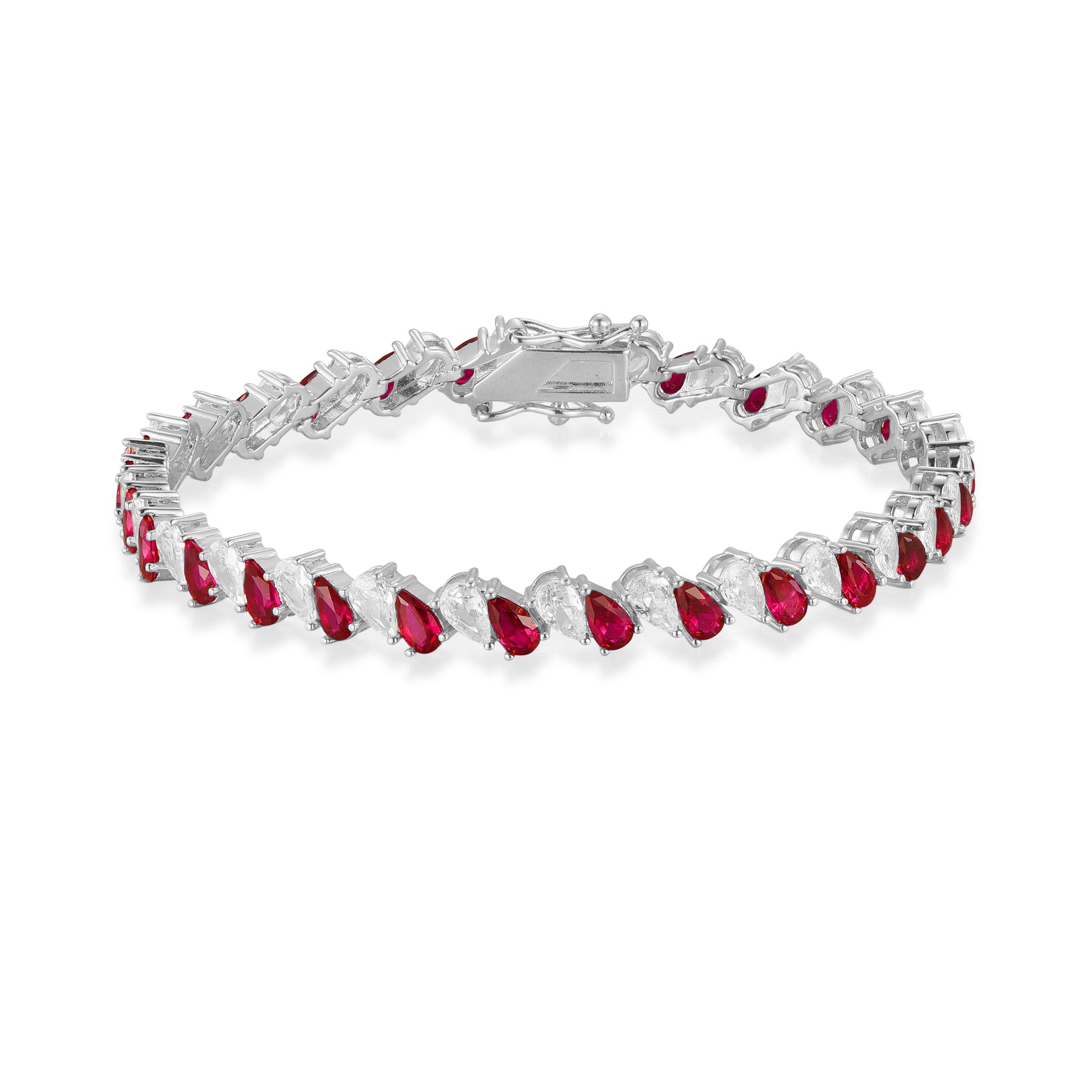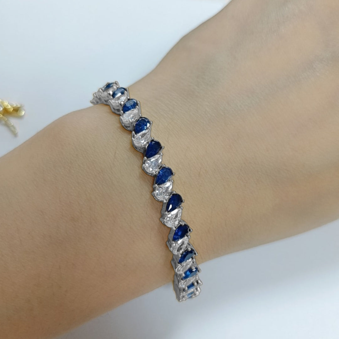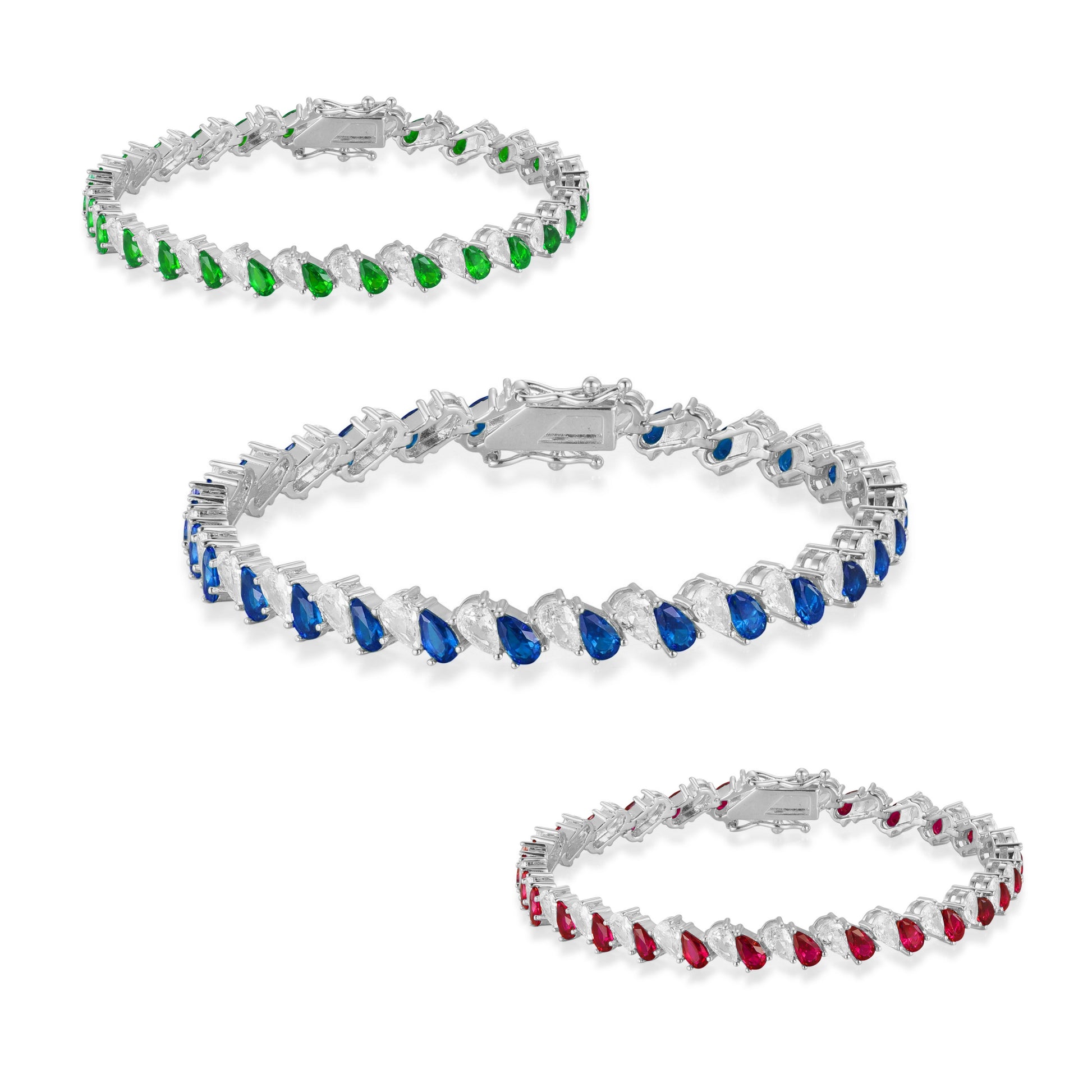 This elegant Sterling Double Pear Silver Tennis Bracelet is an essential addition to any jewelry collection. Crafted from high-quality sterling silver, it features two sparkling pear-cut stones in each link, that are securely set in a timeless design. Exude classic sophistication and style with this stunning bracelet radiating from your wrist.
