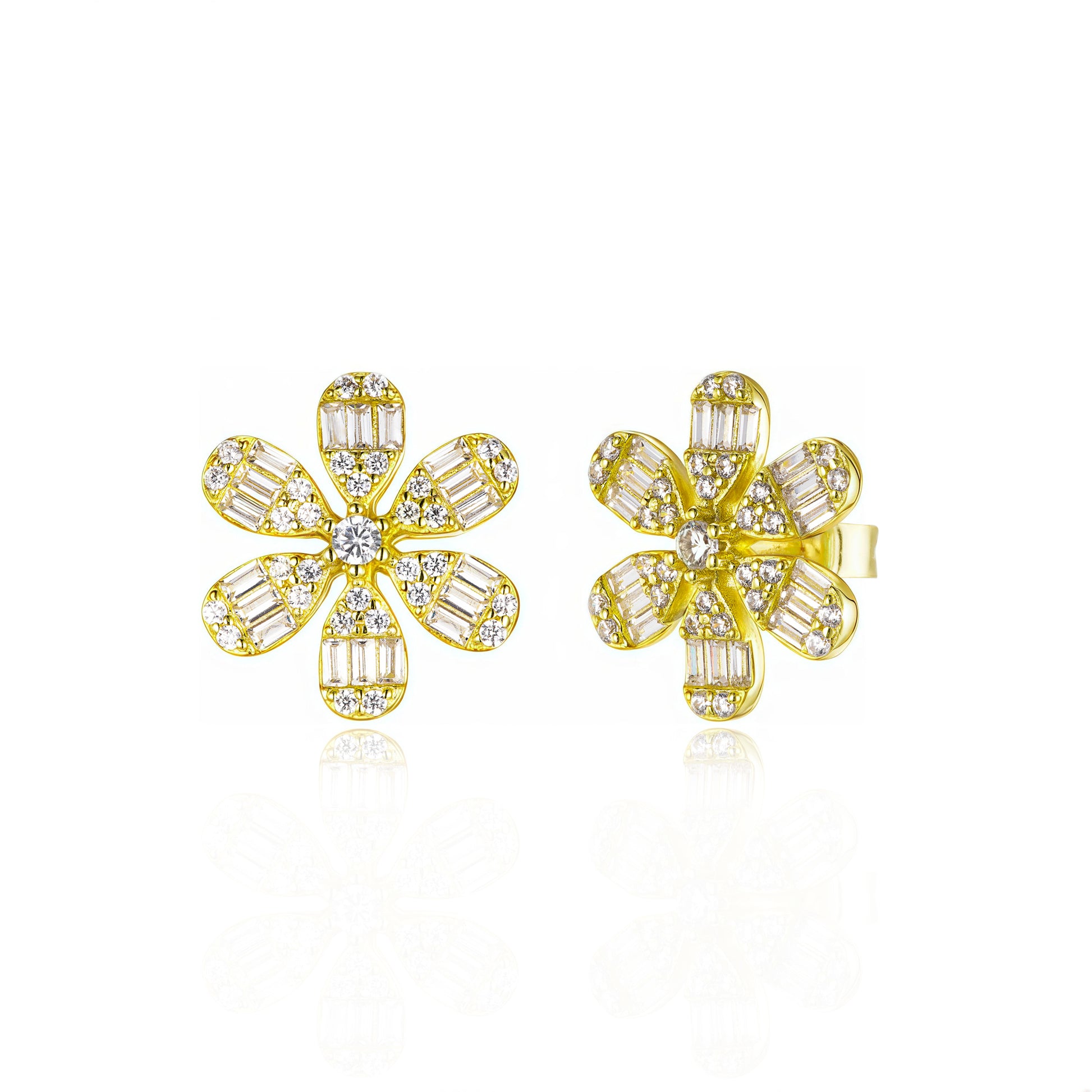 Elegant sterling silver stud earrings featuring a stunning flower design with baguette and round diamonds. These 13mm earrings combine classic sophistication with modern craftsmanship.