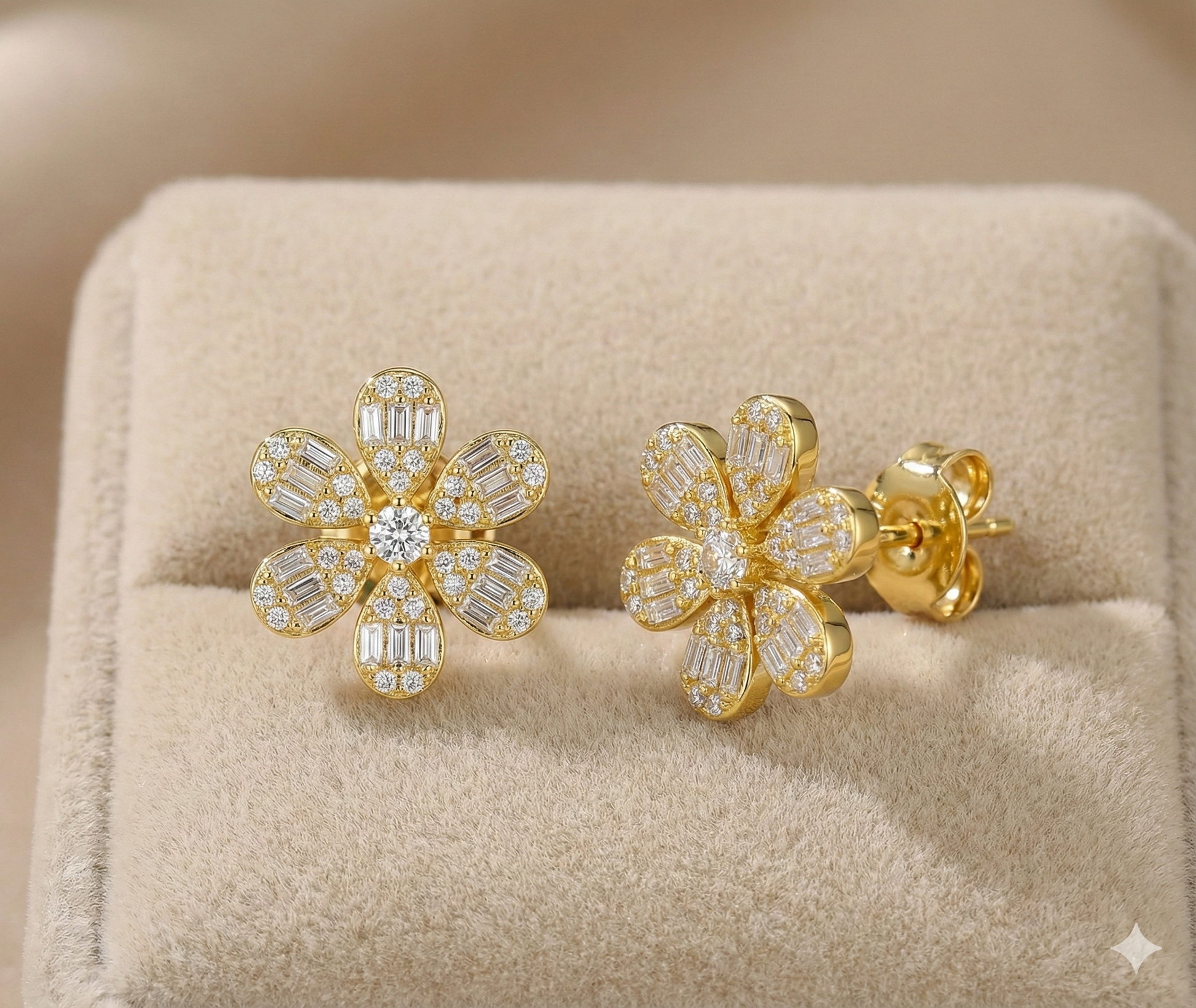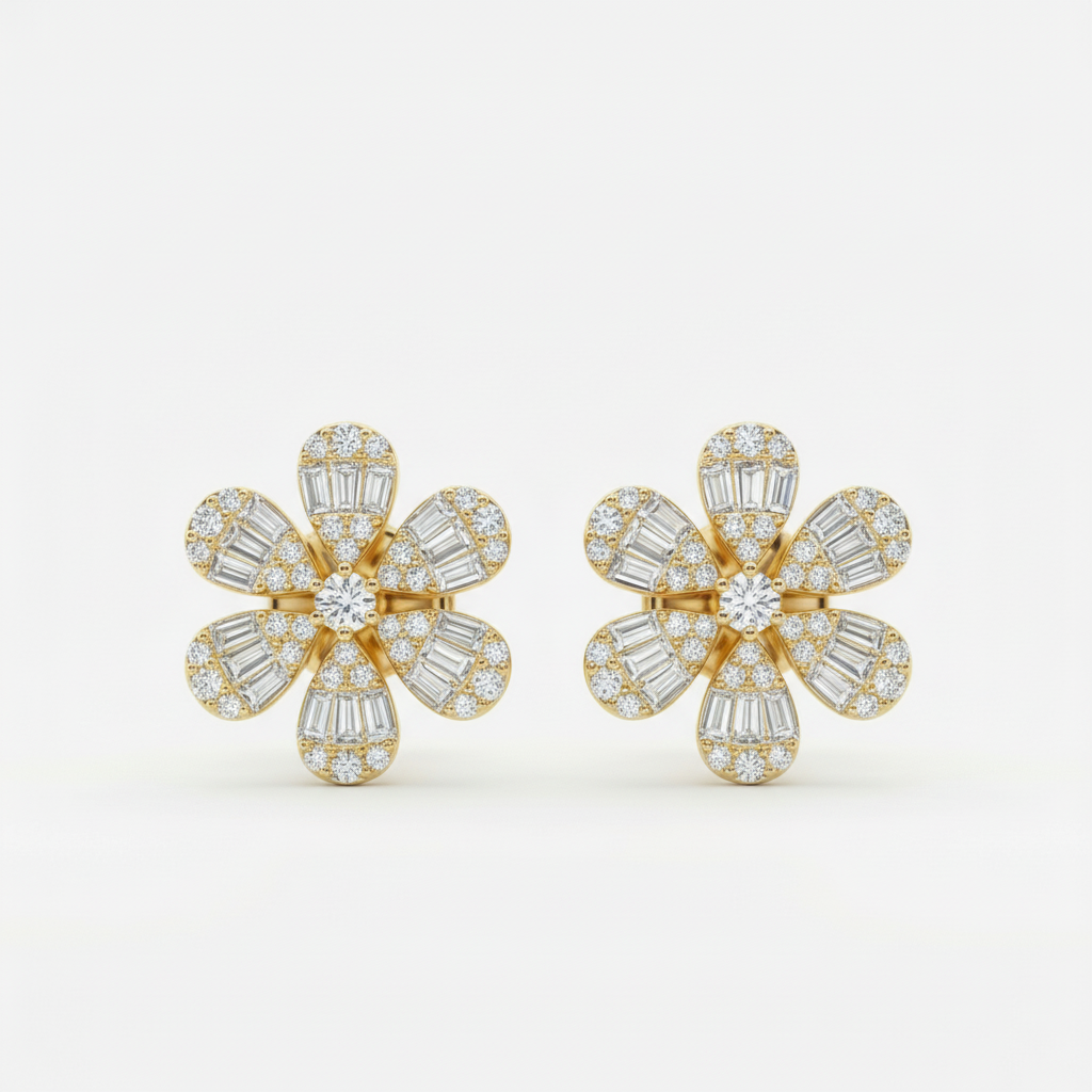 Elegant sterling silver stud earrings featuring a stunning flower design with baguette and round diamonds. These 13mm earrings combine classic sophistication with modern craftsmanship.