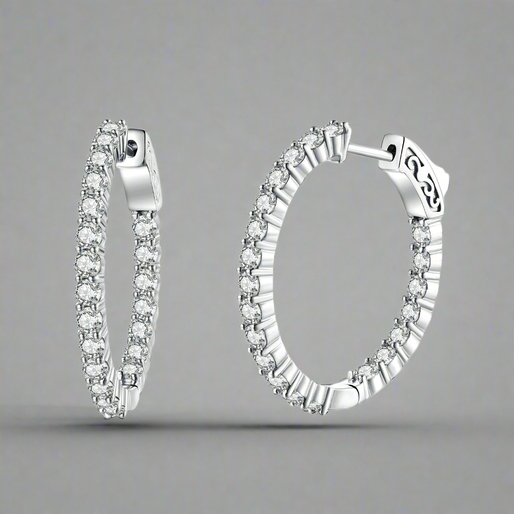 Rhodium Plated Sterling Silver Oval Inside Outside CZ Hoop Earrings with 2.5mm CZs and Button Closure