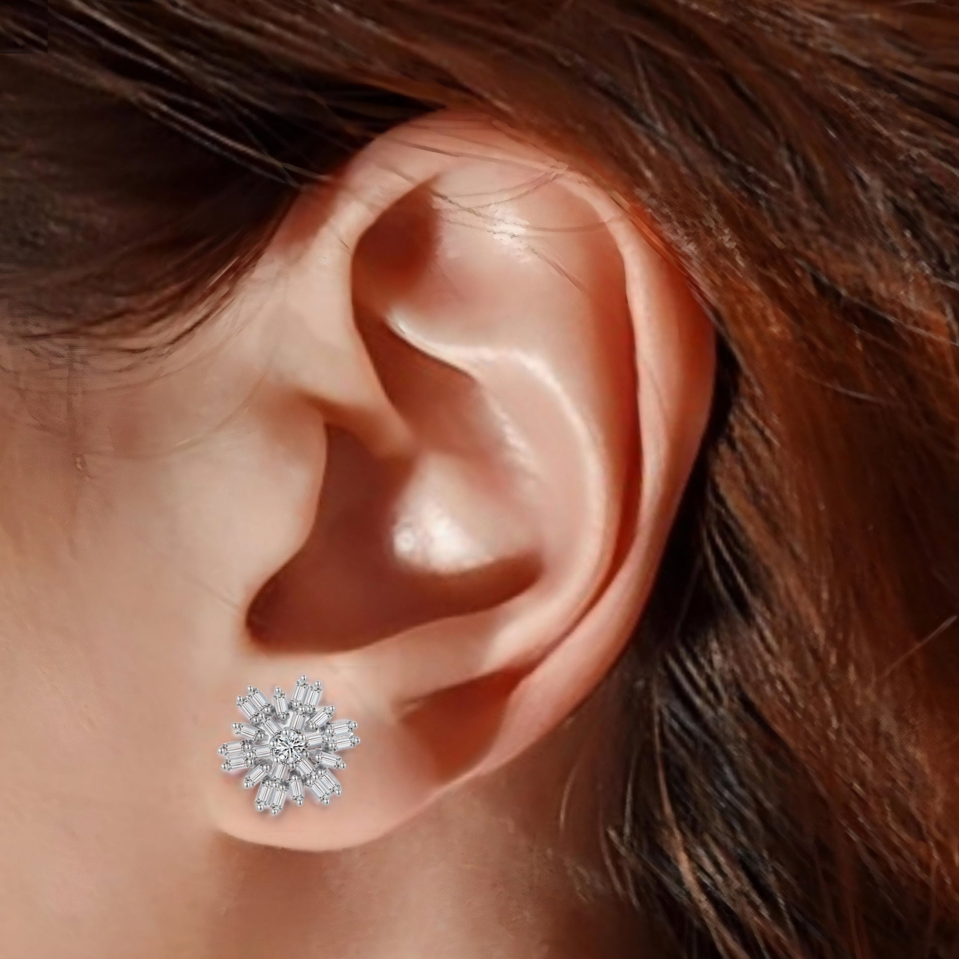 A delicately dazzling pair of sterling silver baguette earrings. They have a unique snowflake shape that adds a charming touch of grace to your outfits. They're dainty and pretty to bring glamor to your outfits without overdoing it. You'll be able to accessorize these versatile earrings with pretty much anything in your wardrobe. They're rhodium-plated for durability. They're pretty little stud earrings that are only 12mm for comfortable wear.