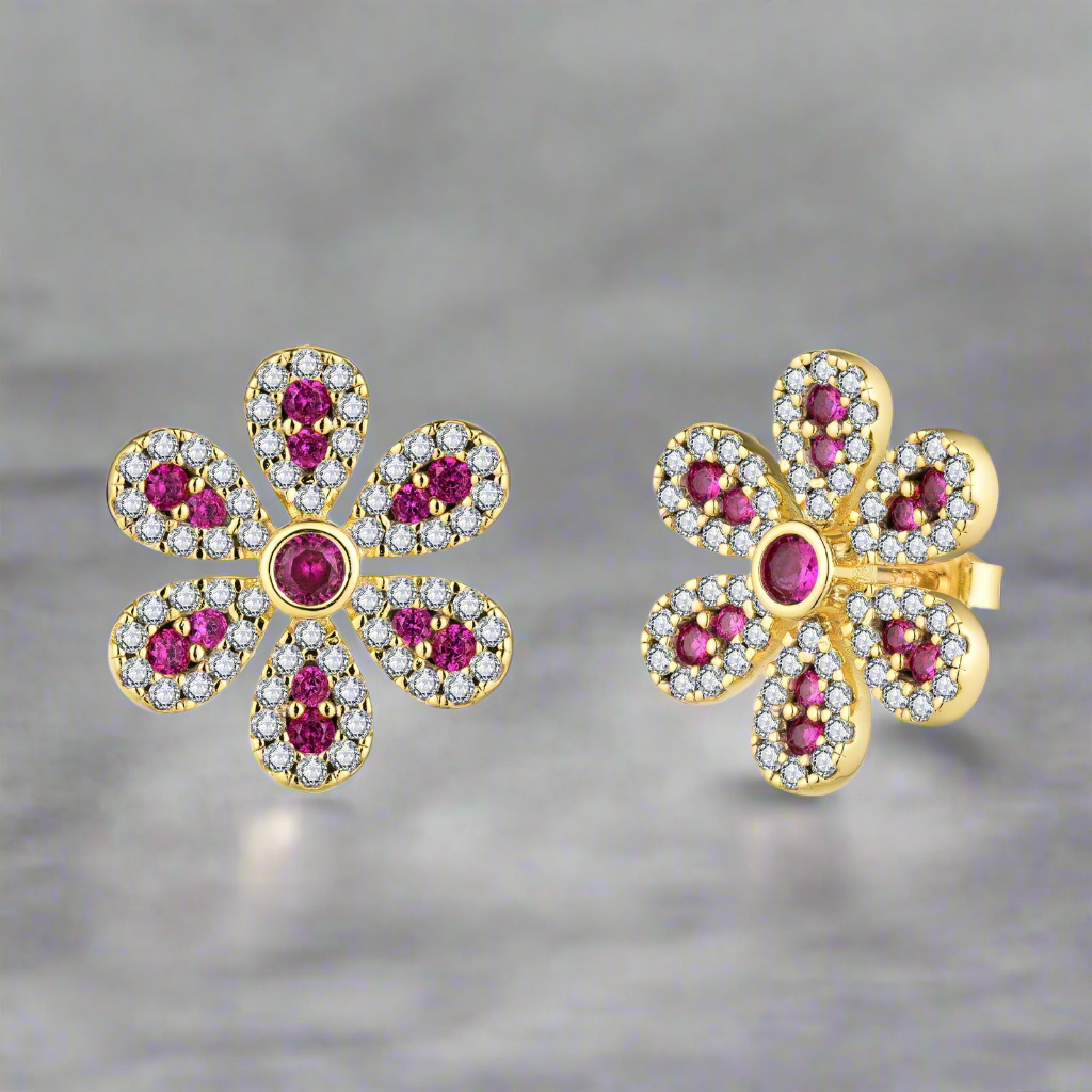 Sublime Gold-Plated Sterling Silver, delicately adorned with either a Sparkling Ruby or Sapphire Cubic Zirconia Flower, elegantly hangs from the ears in a classic Stud Earring design of 16mm. An alluring adornment that will propel any ensemble to an elevated level of sophistication. Skillfully crafted with utmost quality and finesse, this inimitable piece is designed to stand the test of time.