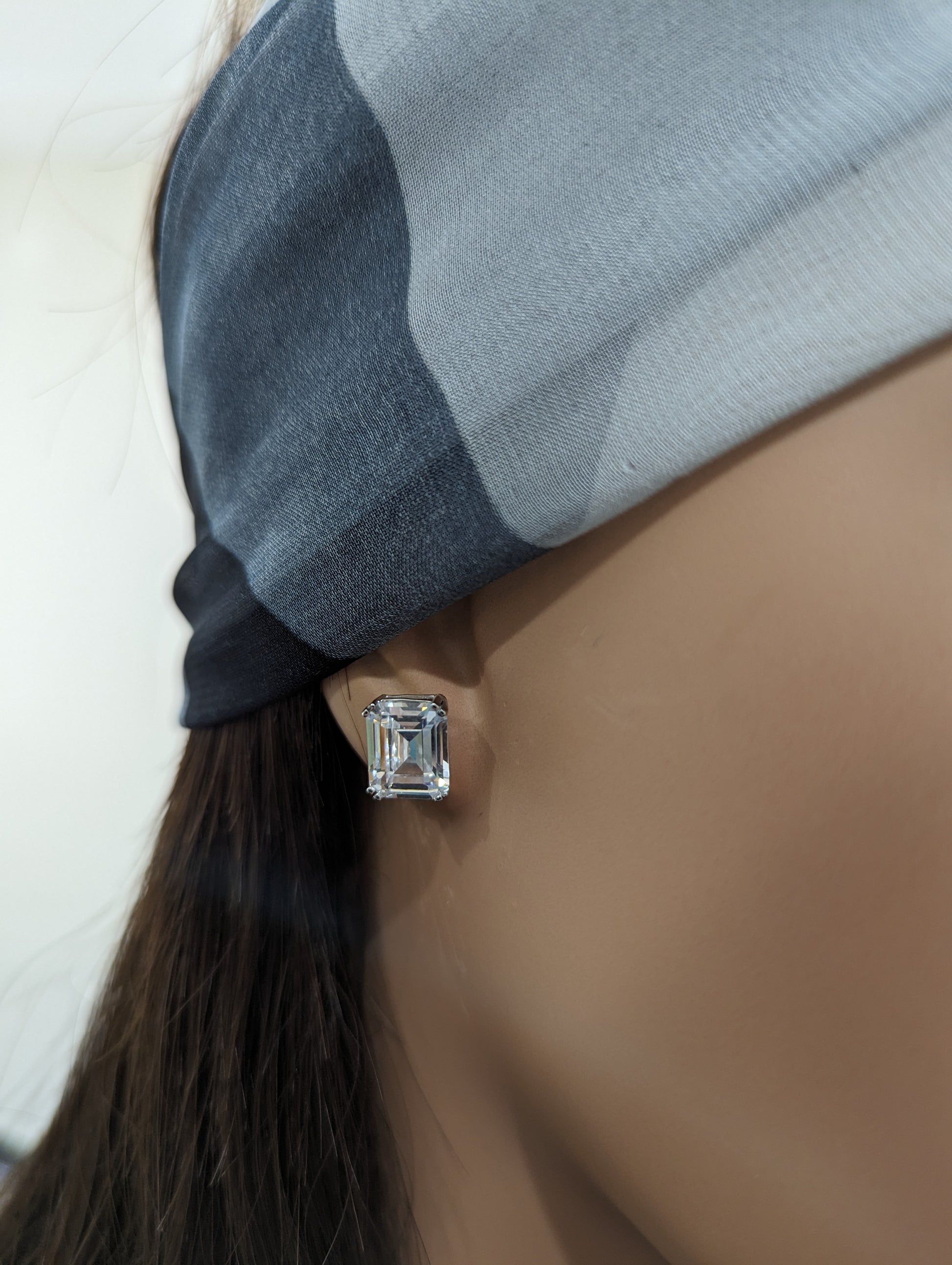 Crafted with precision and attention to detail, these stud earrings feature a dazzling emerald-cut cubic zirconia stone, expertly faceted to showcase its impeccable clarity and brilliance. The stone is securely set in a premium quality rhodium-plated sterling silver frame, ensuring durability and long-lasting shine.