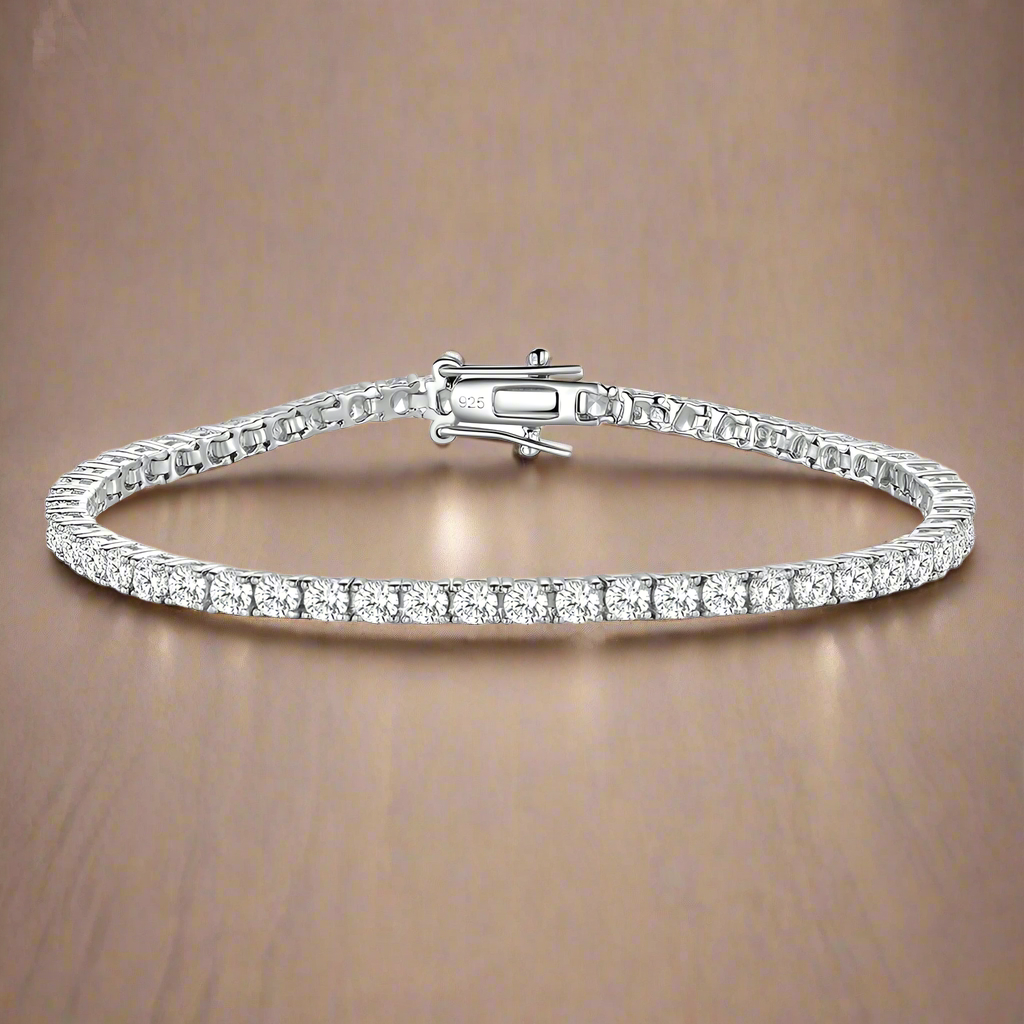 Sterling silver rhodium-plated round brilliant cut CZ tennis bracelet. Adorn your wrist with the timeless brilliance of this sparkling tennis bracelet, crafted with rhodium-plated .925 sterling silver and set with dazzling round brilliant cut cubic zirconia stones. An eye-catching accessory for any occasion.