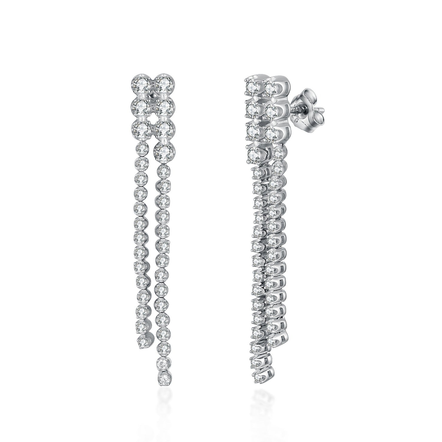 This exquisite rhodium plated sterling silver earring features a double row of shimmering cubic zirconia (CZ) stones, making it the perfect addition to your jewelry collection. The tennis-style design is set on a post backing, ensuring a secure and comfortable fit. Measuring 2 inches in length, these earrings are the ideal finishing touch to any outfit, adding and elegant and sophisticated touch to any look.