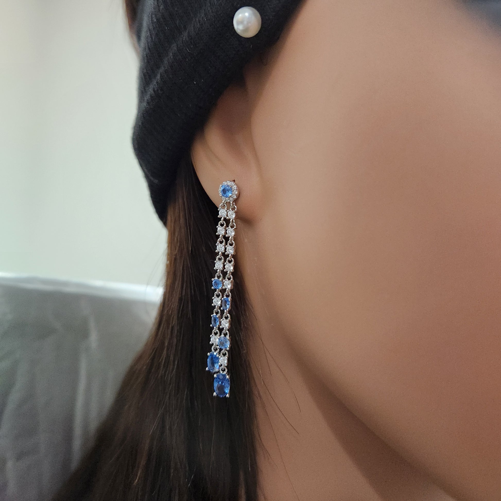 Add depth and sparkle to your look with these stunning Sterling Silver Double Strand Light Blue and Clear CZ Earrings! Elevate your style and make a statement with these beautiful earrings, perfect for any occasion. They are versatile and sure to catch the eye of everyone around you. Don't miss out on owning these gorgeous 2'' earrings today!