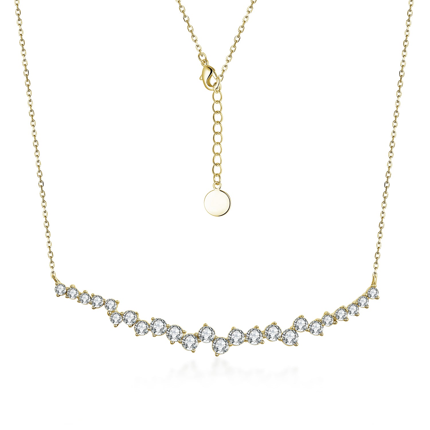 This elegant product showcases a magnificent 18K yellow gold-plated or rhodium plated sterling silver bar necklace featuring an alluring cubic zirconia pendant. With its timeless design and sleek texture, this necklace exudes sophistication and adds a touch of glamour to any ensemble. Whether you're dressing up or dressing down, this eye-catching piece is sure to turn heads!