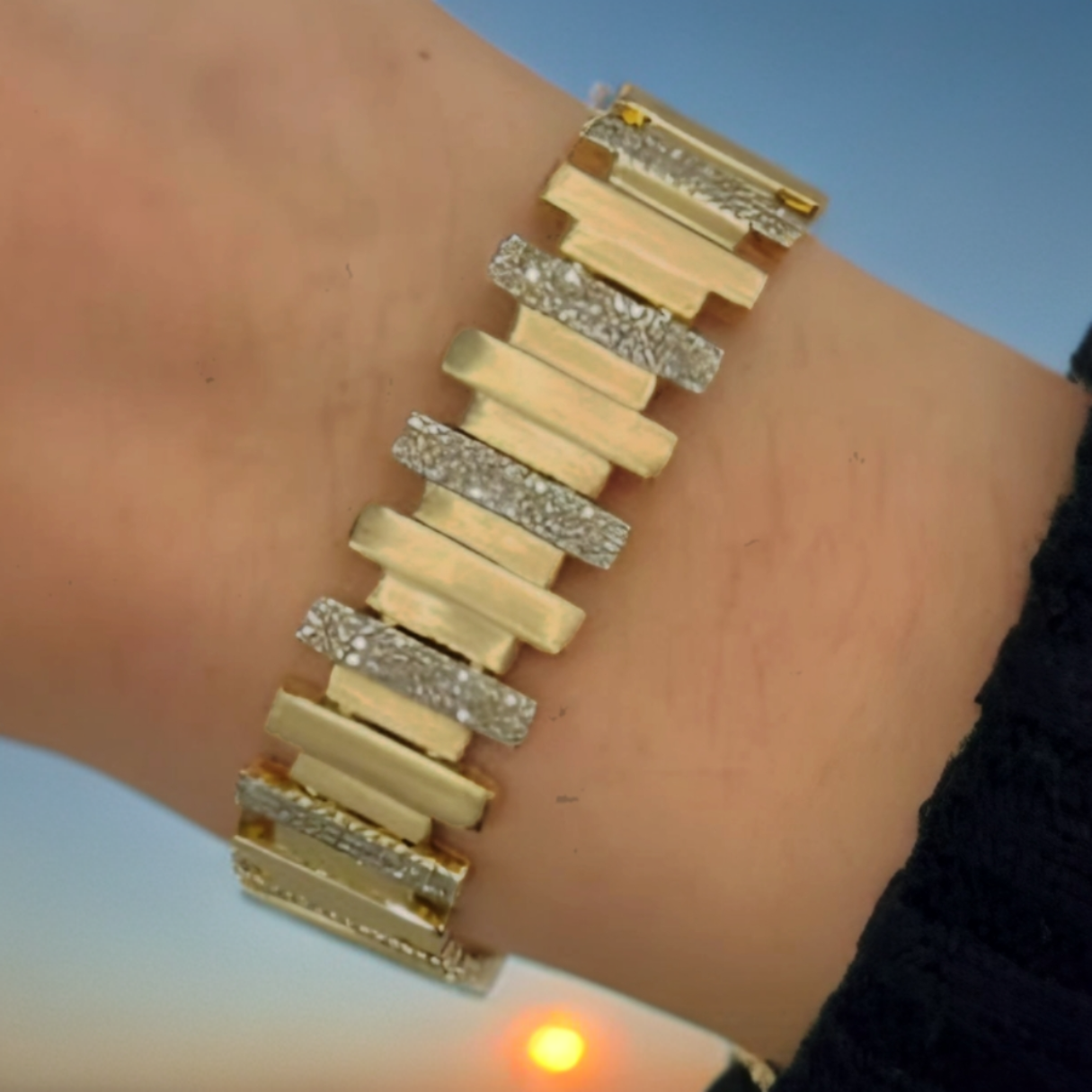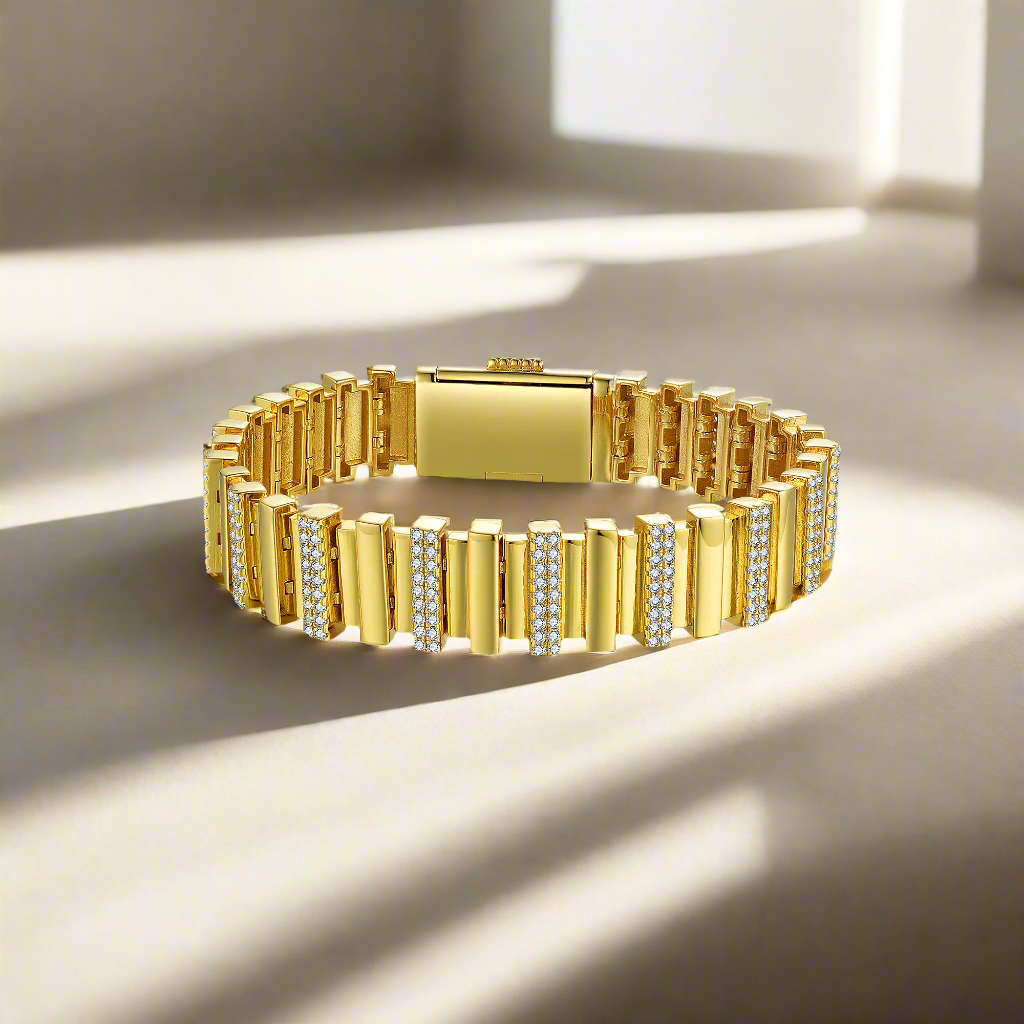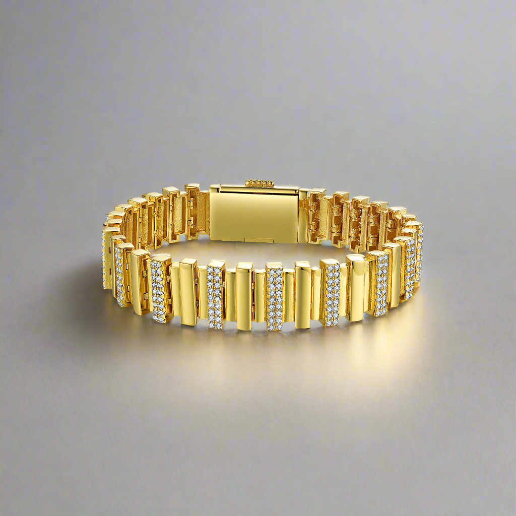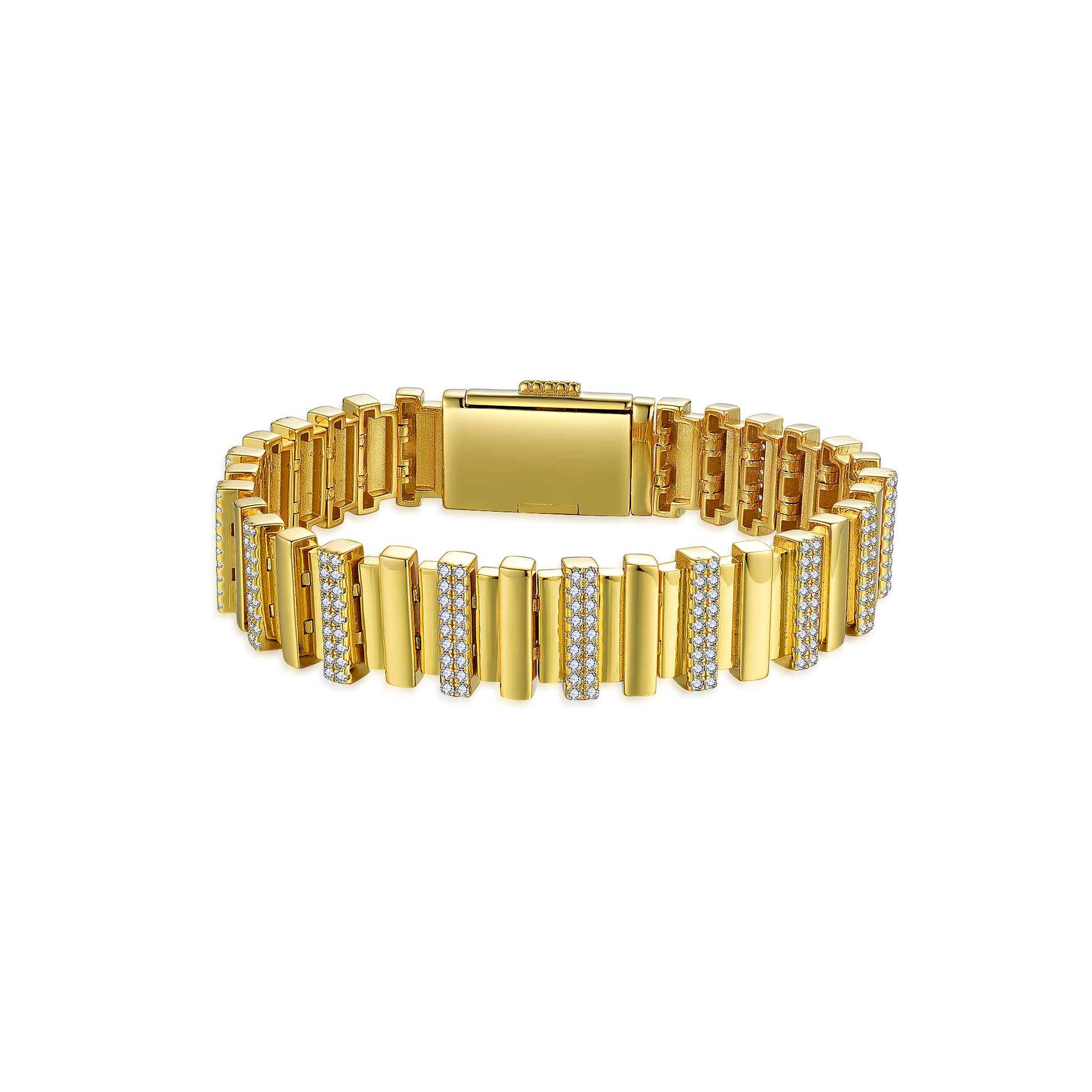 Experience the elegance and luxury of our Sterling Silver Gold Plated Bar With CZ Bracelet, measuring 6.5" and featuring a stunning 12mm width. Indulge in the opulence of sparkling cubic zirconia and the timeless beauty of gold, all crafted into one exquisite piece. Elevate your style and make a statement with this must-have accessory.