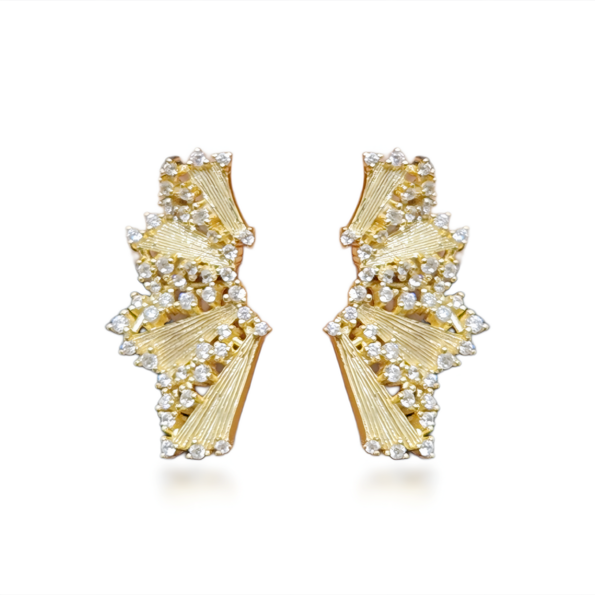 Beautiful 20mm stud earrings featuring a cascading fan design in sterling silver with brushed gold plating, highlighted by sparkling CZ stones.