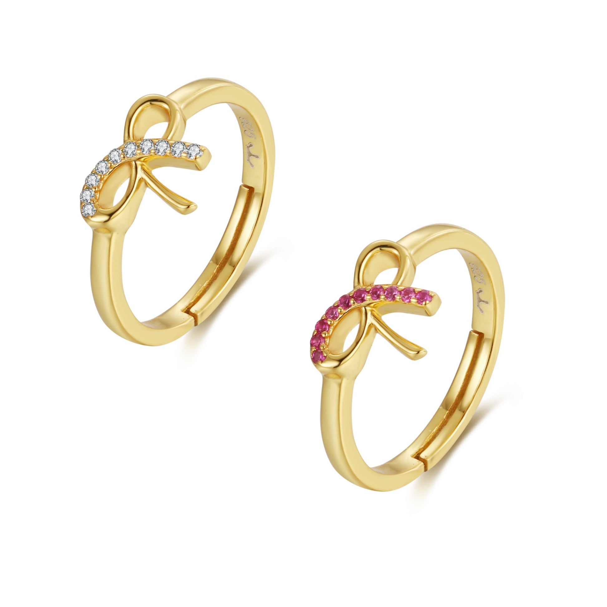 Indulge your child with this stunning Sterling Silver Gold Plated CZ Bowknot Ring, available in adjustable sizes 3-5 and 5-7. The dazzling choice of clear or ruby CZ stones will captivate their imagination and bring a touch of glamour to any outfit!