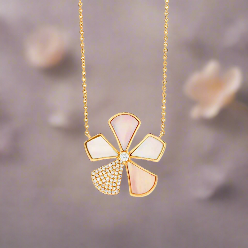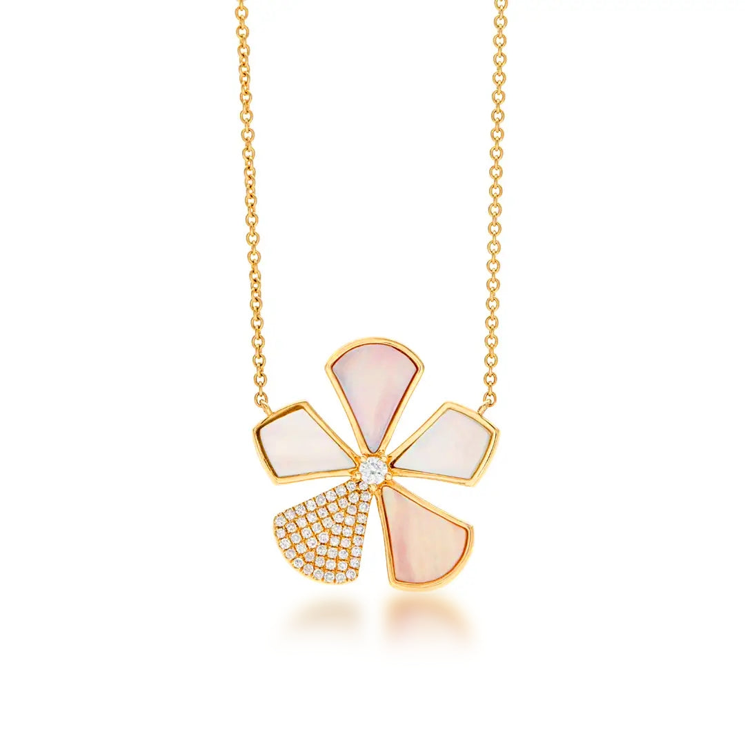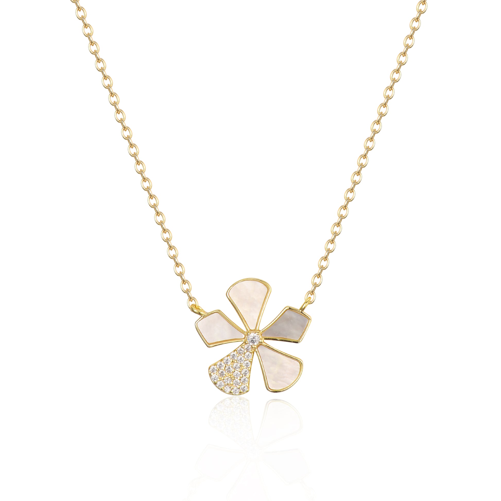 Sterling Silver Gold Plated Mother of Pearl And CZ Five Petal Flowers Necklace