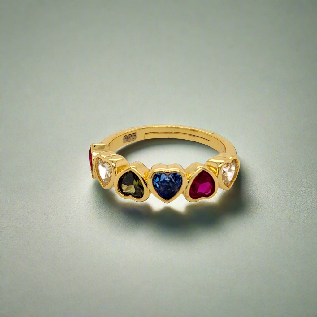 Experience the beauty of this Sterling Silver Gold Plated Multicolor Heart Ring with its adjustable design.