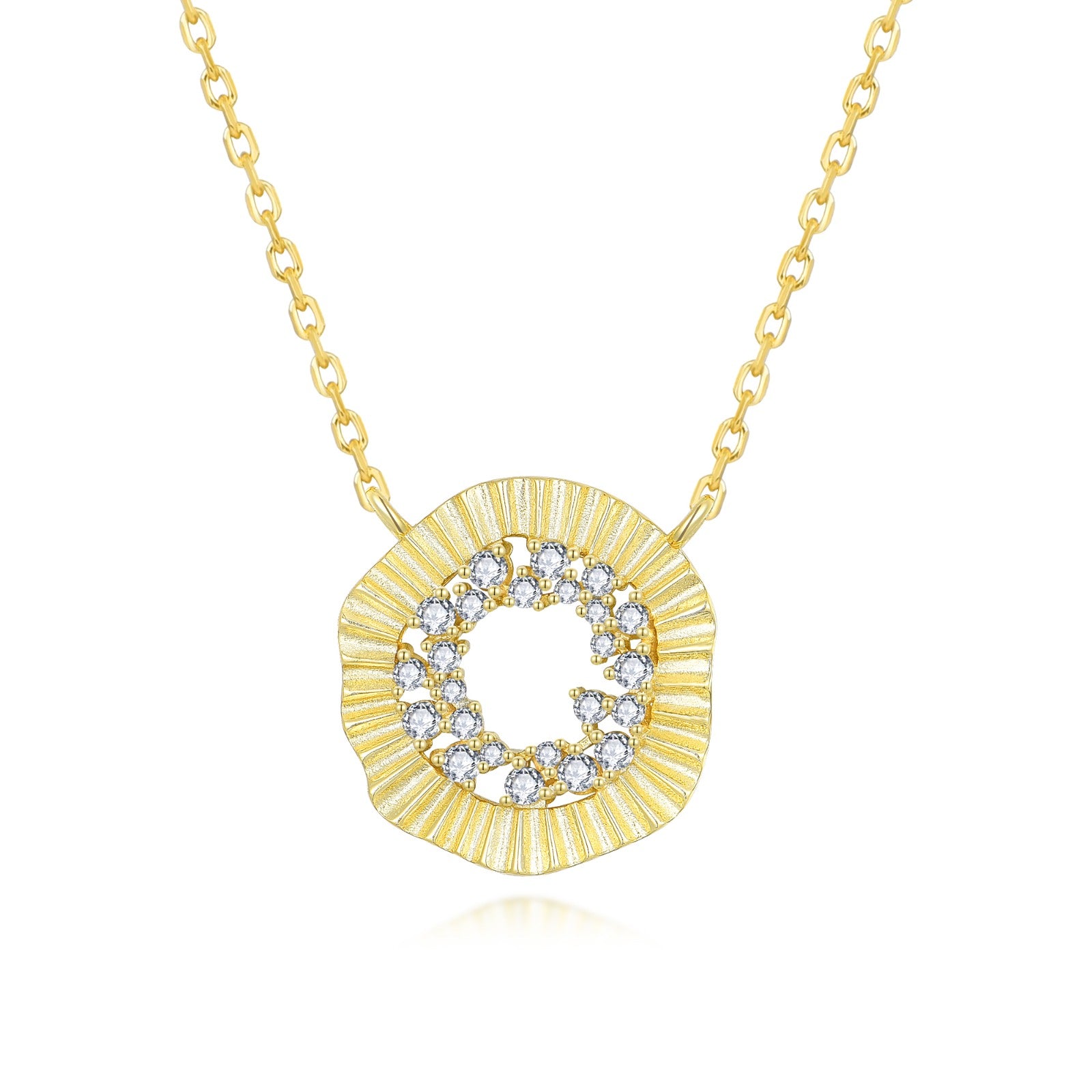 This stunning necklace features a rounded fan-shaped pendant with a sparkling CZ center, crafted from sterling silver and finished with gold plating. Measuring 16mm by 25mm, it comes with an adjustable 14'' plus 3'' chain for the perfect fit.