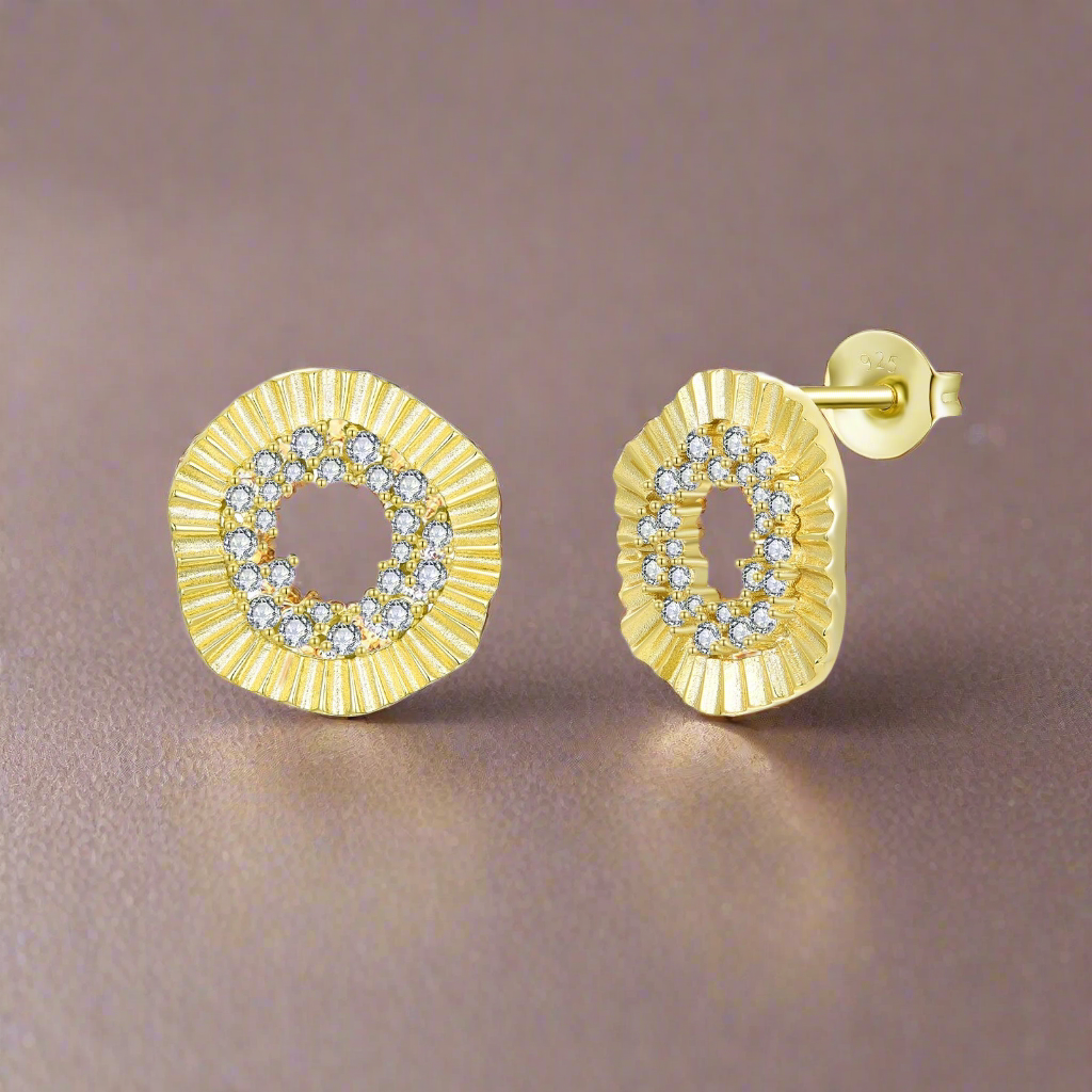 Sterling Silver Gold Plated Rounded Fan Shape CZ Center Stud Earrings