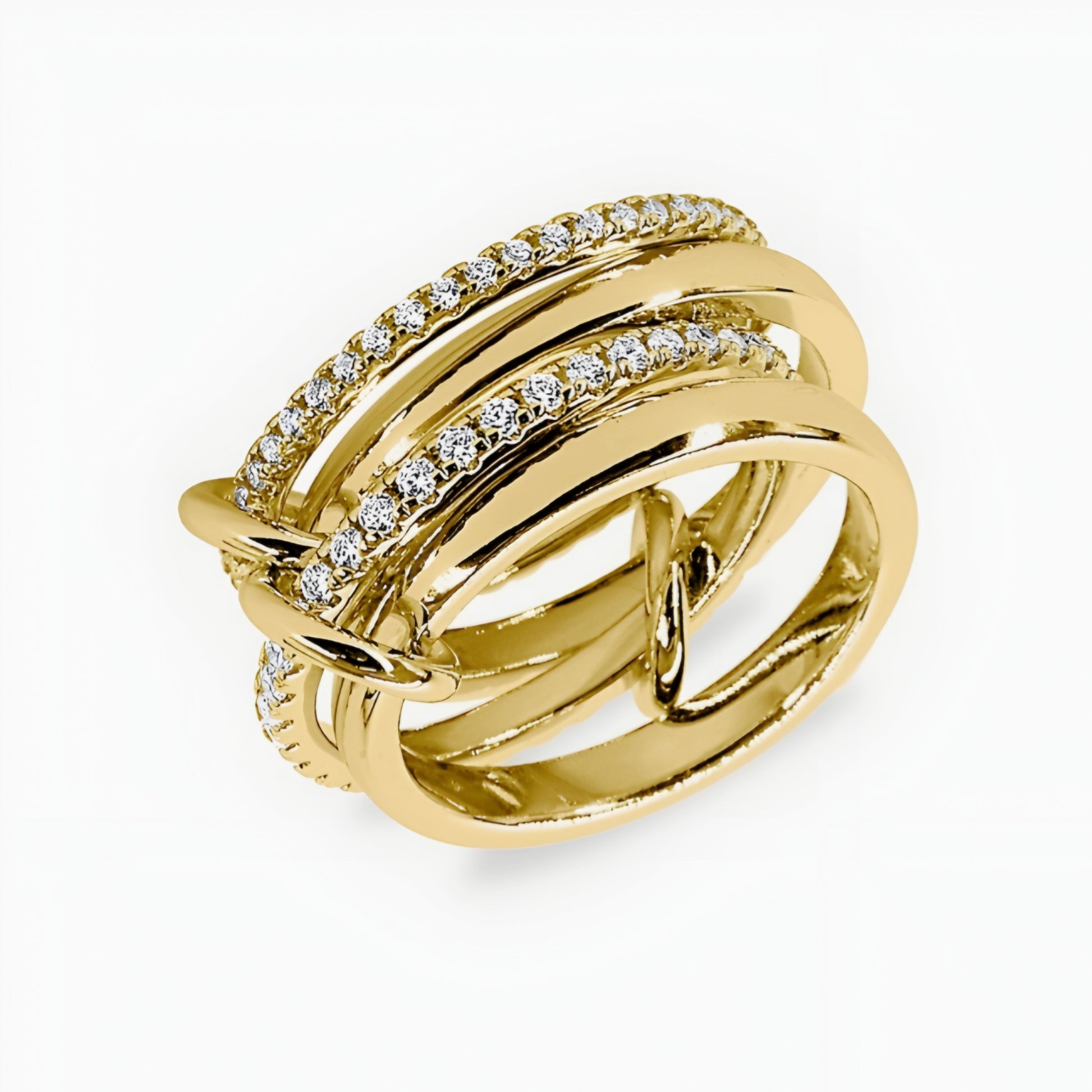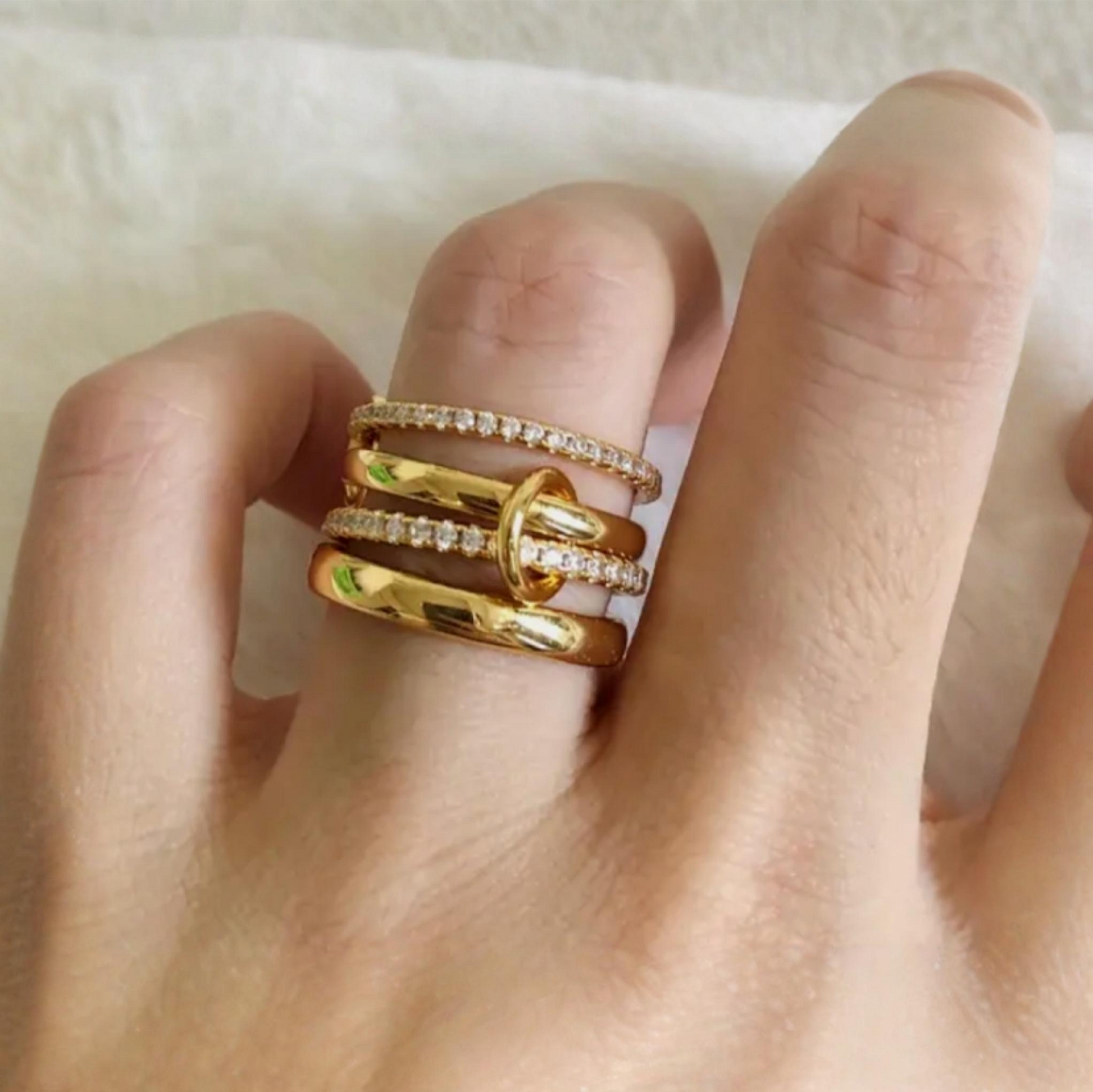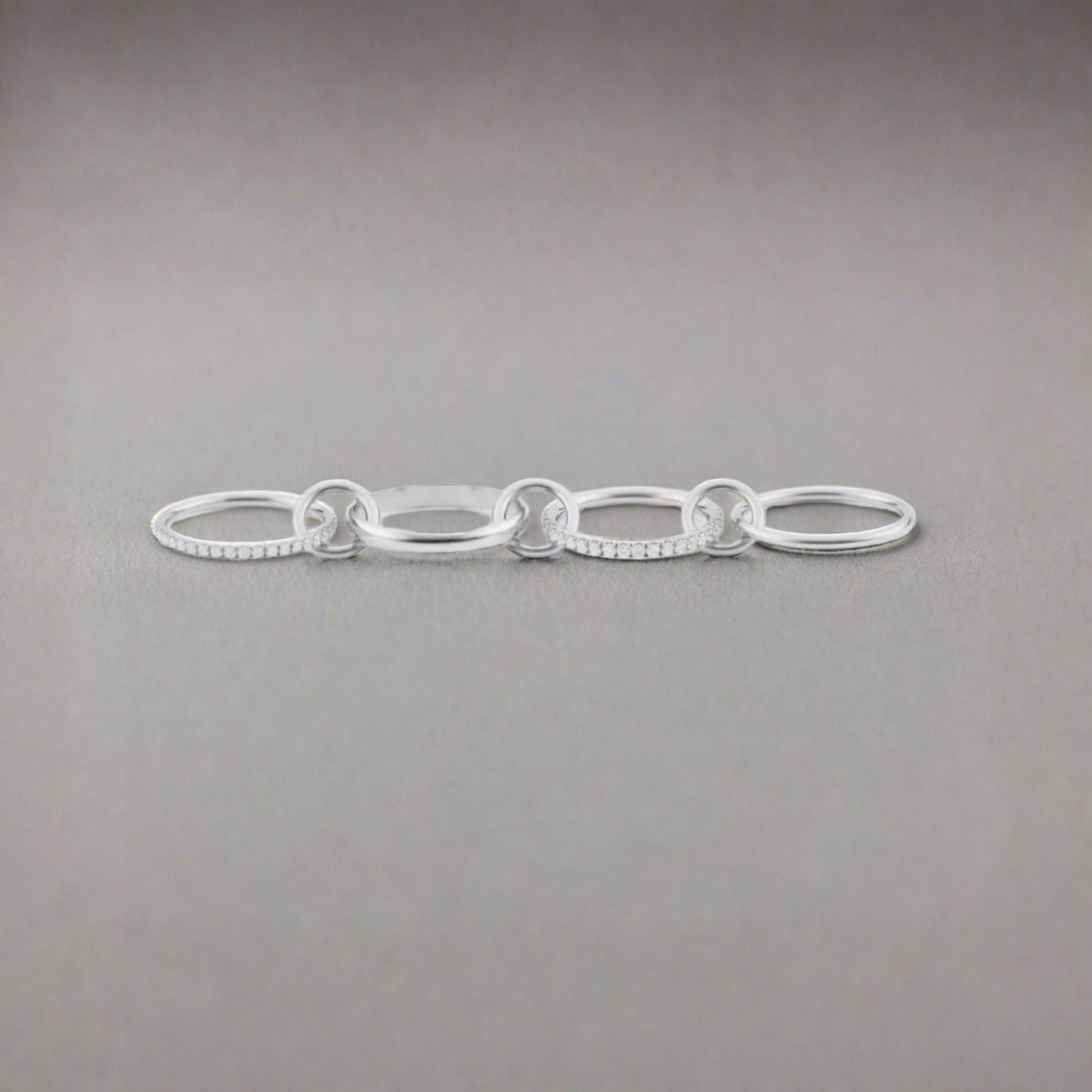 Elevate your style with this multi-layered sterling silver ring set, available in 14k gold or rhodium plating, is adorned with sparkling cubic zirconia bands for a touch of glamour. The interlinked design adds a modern twist to any outfit, making it the perfect statement piece for any occasion.