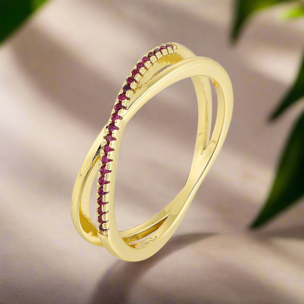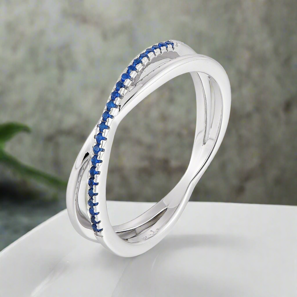 Embrace luxury with the stunning Sterling Silver Micropave Crossover Sapphire or Ruby CZ Ring, available in rhodium with sapphire CZ or gold micron plated with ruby CZ.