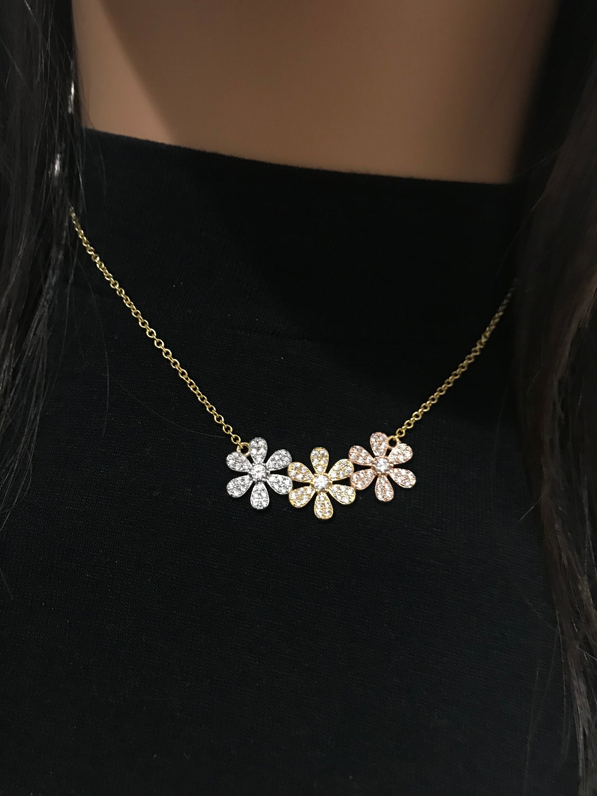 This sterling silver necklace features three 12mm triple flower pendants adorned with sparkling CZ micropave stones. Measuring 14" with a 2" extender, it offers adjustable length for the perfect fit. Choose from elegant gold-plated or stylish tricolor finishes to complement any outfit.