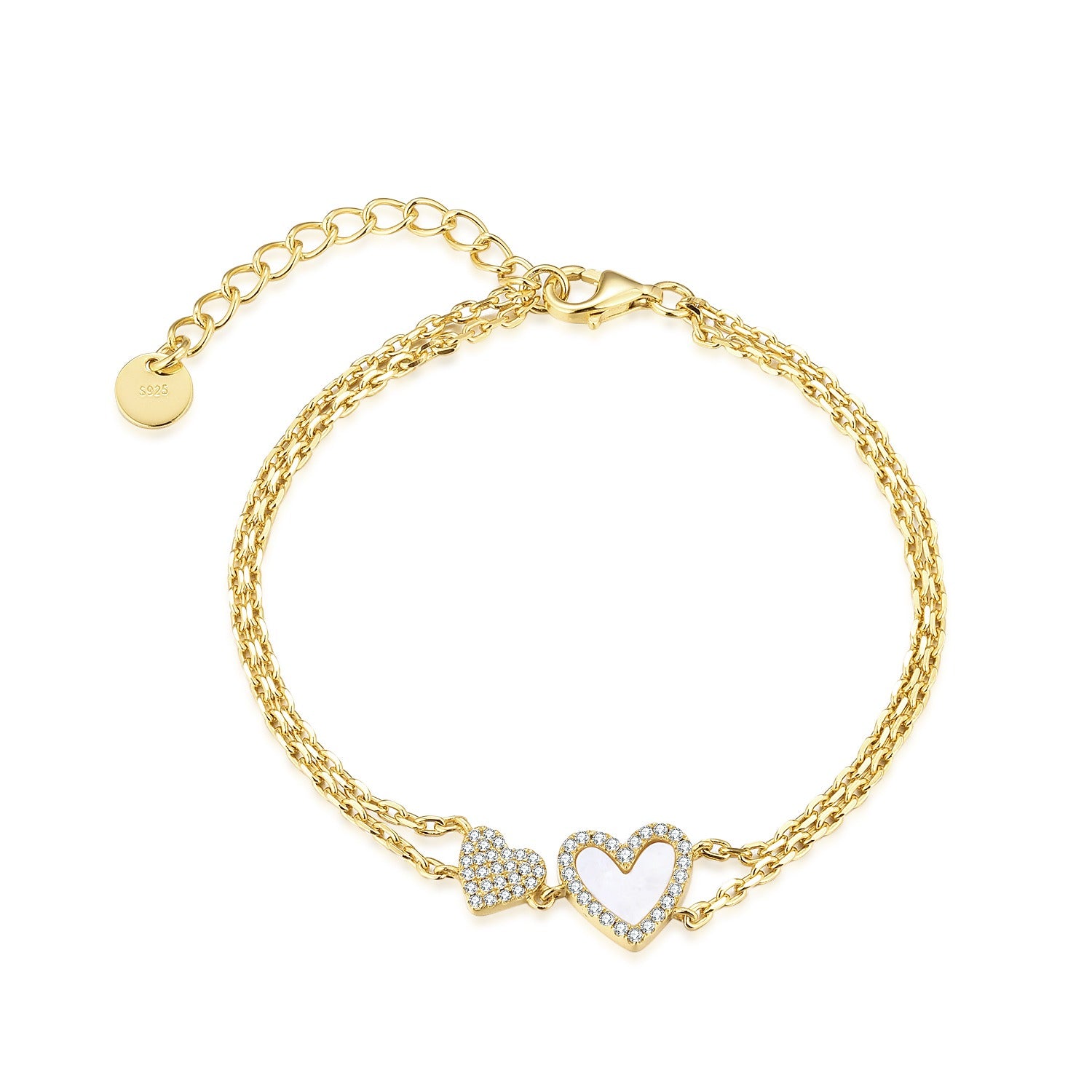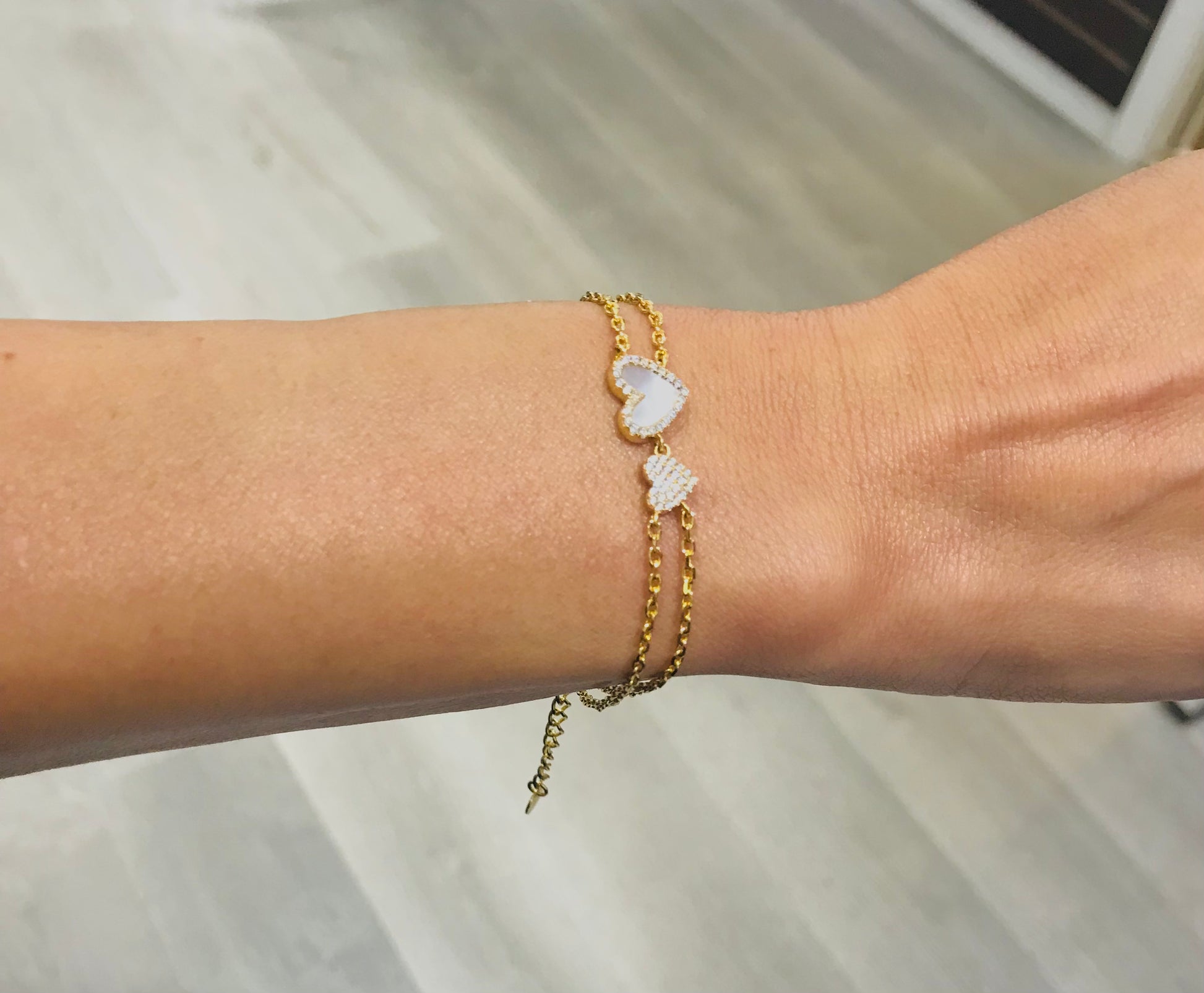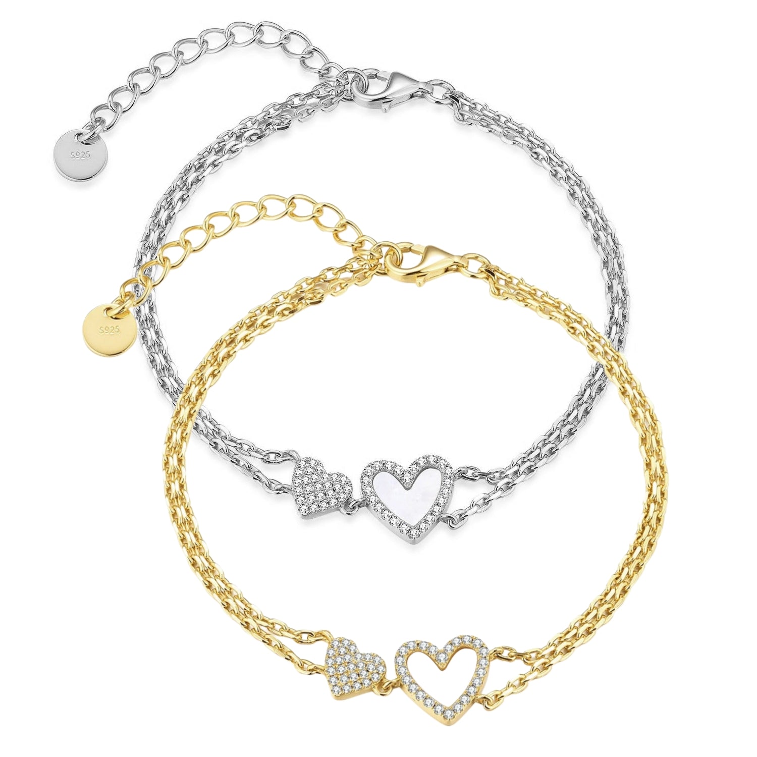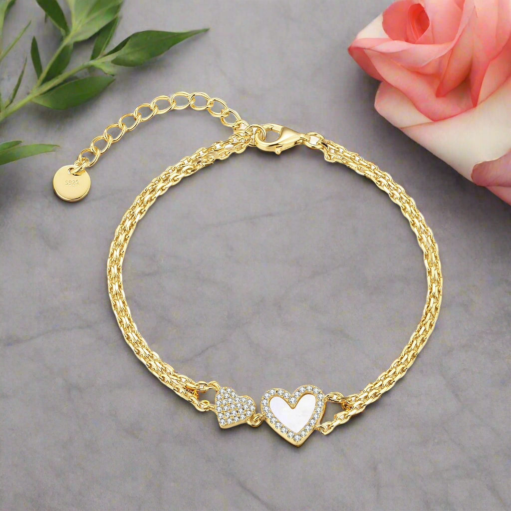 Our stylish two strand sterling silver bracelet is adorned with two hearts, each featuring dazzling cubic zirconia stones. One is fully micropave, and one borders a luminous mother of pearl center. Perfect for daily wear or as a thoughtful gift, this eye-catching design will draw admiring glances and add a touch of elegance to any outfit! The centerpiece measures 6.5mm x 9.5mm.