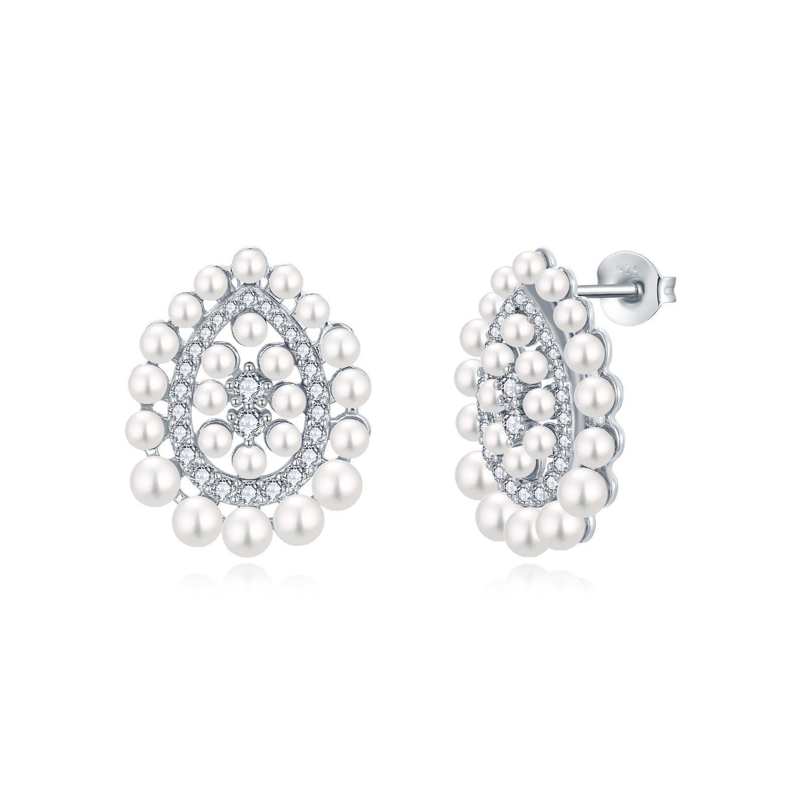 Elegant sterling silver stud earrings featuring pear-shaped pearls accented with CZ stones, measuring 20mm.