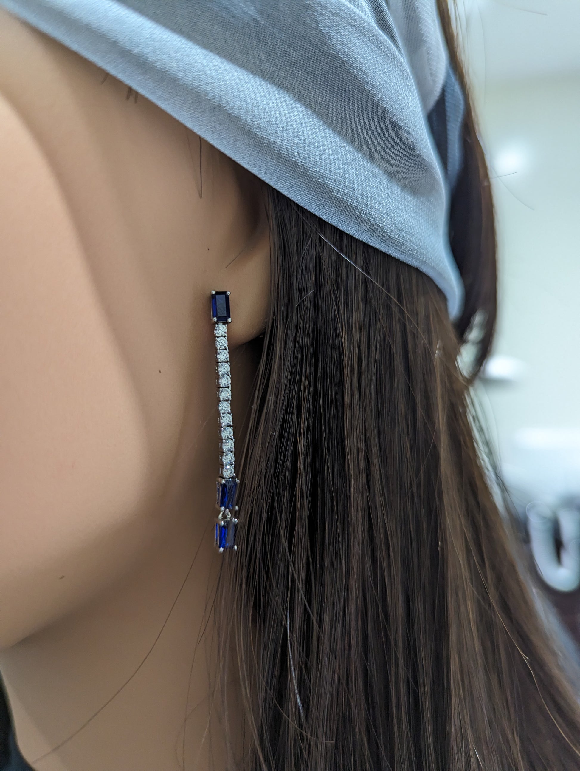Enhance your style with this stunning pair of Rhodium Plated Sterling Silver Sapphire Accented CZ Tennis Earrings. Featuring exquisite sapphire color baguettes and round clear CZ stones, these earrings are the perfect addition to your jewelry collection. The earrings measure 1.6" in length, making them an ideal choice for everyday wear. With its high-quality craftsmanship and premium materials, this piece is sure to become a cherished item for years to come. Don't miss out on the chance to own this exquisite pair of earrings today!