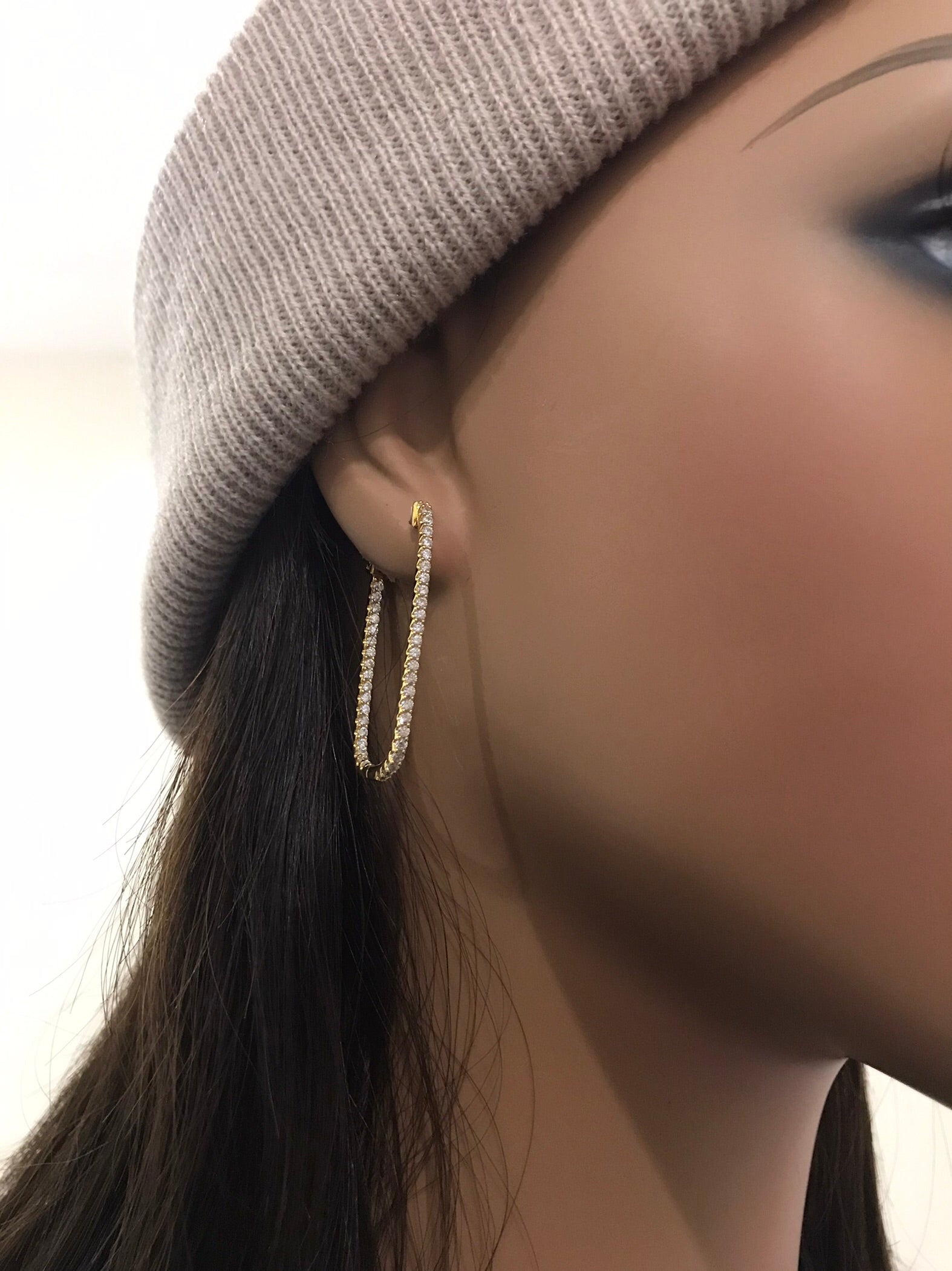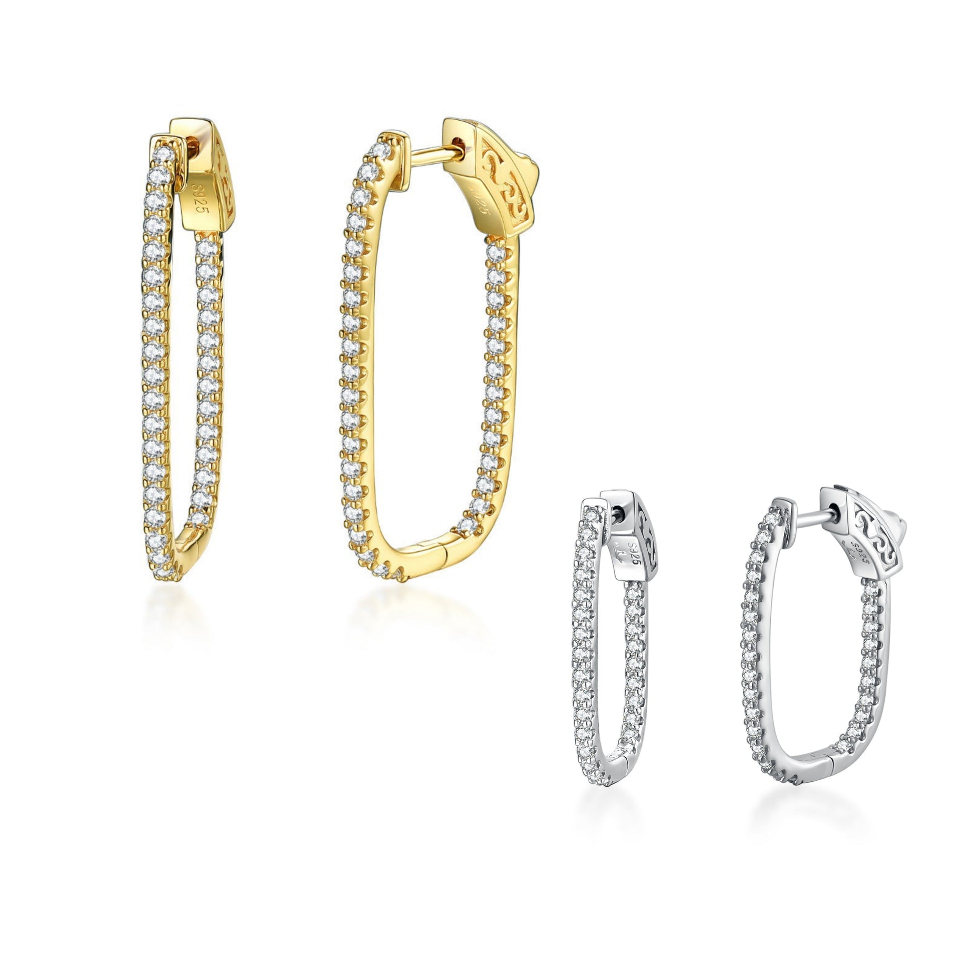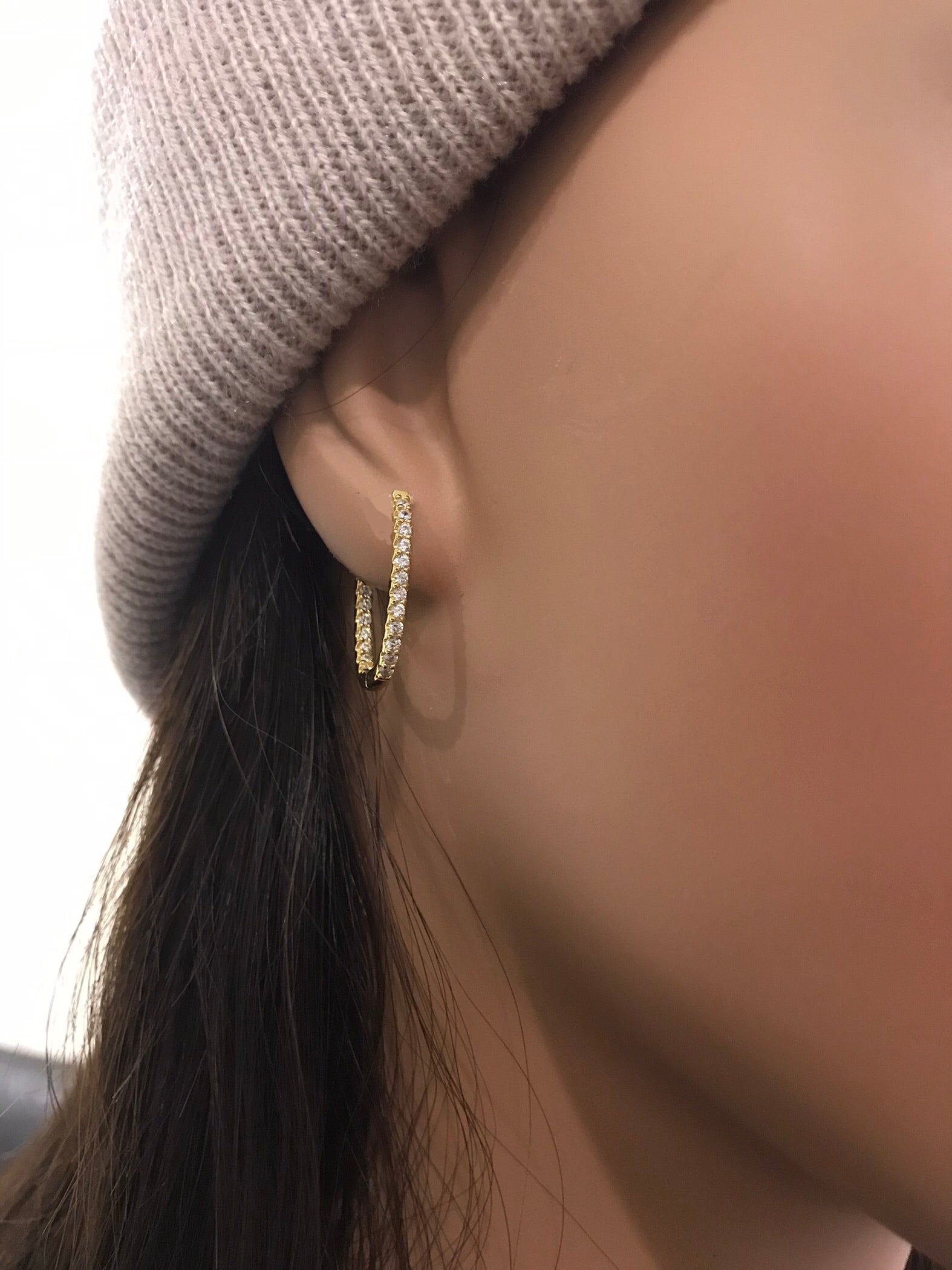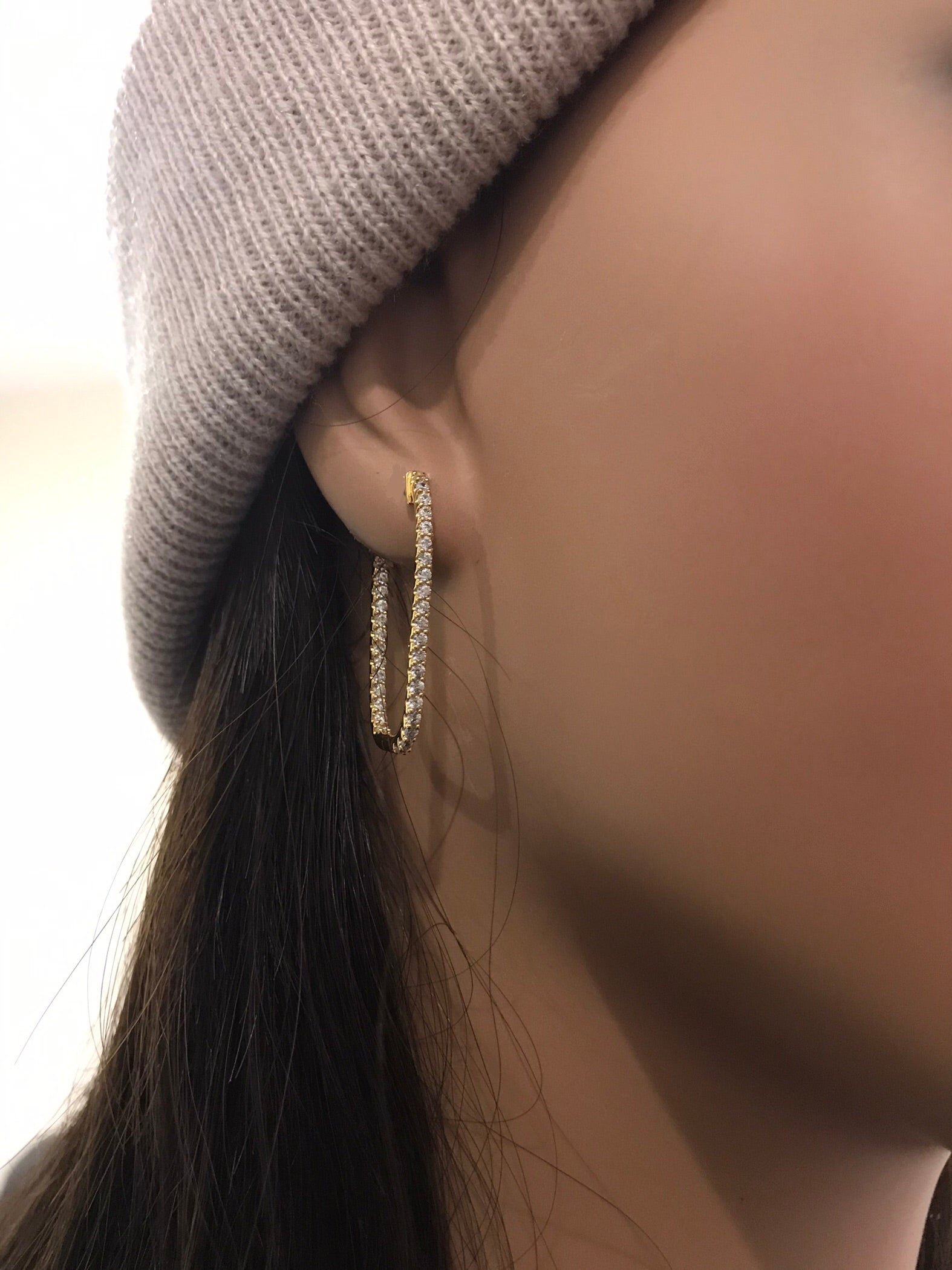 These Sterling Silver Thin CZ Rectangular Hoops are available in either gold or rhodium plating. They feature sparkling 1.5mm cubic zirconia stones, and come in four sizes: a large hoop measuring ~1.5 inches, a medium hoop measuring ~1.25 inches, a small hoop measuring ~1", (these three varieties come with a convenient and secure button lock) and a slightly smaller hoop (with regular click in lock) measuring ~.8" . These hoops are perfect for adding a touch of elegance and sparkle to any outfit.