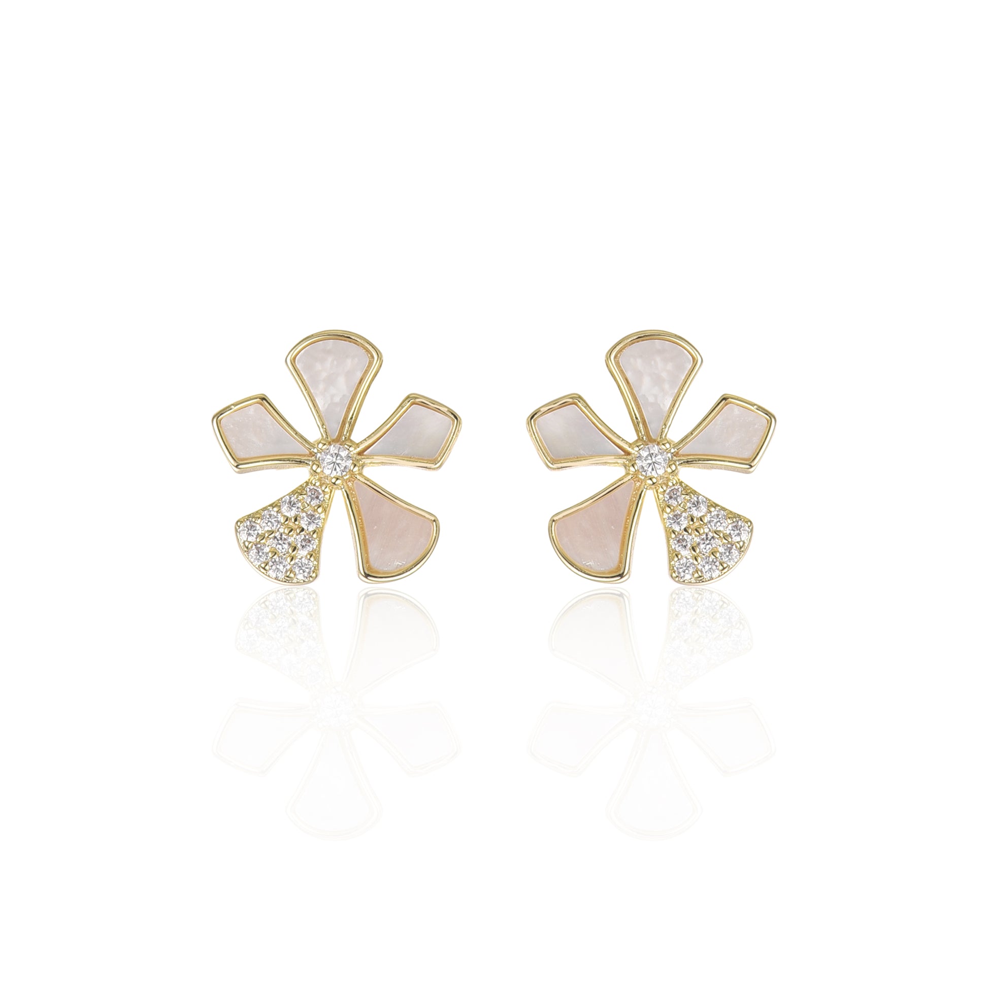 Surgical Steel Gold Plated Mother of Pearl And CZ Five Petal Flower Stud Earring