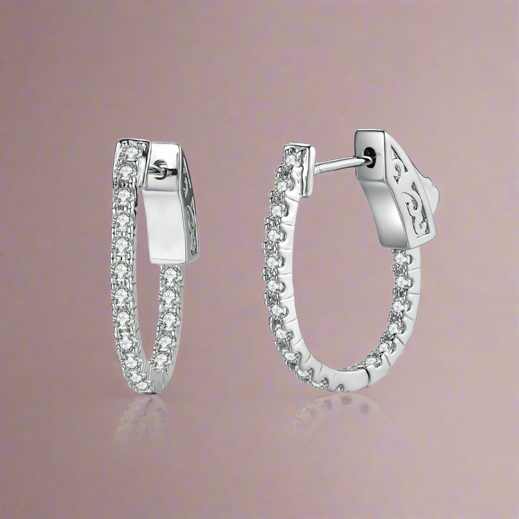 This beautiful and stylish rhodium plated hoop earring is made from high-quality, hypoallergenic surgical steel, making it suitable for all skin types. The spring button lock makes it easy to put on or take off, yet secure. while the CZ inside out design adds a touch of sparkle.